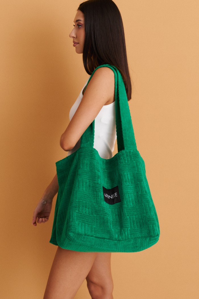 Вместительная стильная сумка-шоппер выполнена из фактурного полотна насыщенного зеленого цвета.