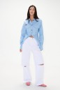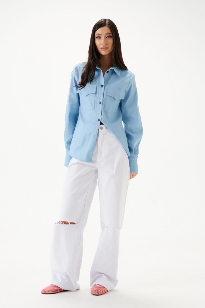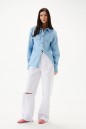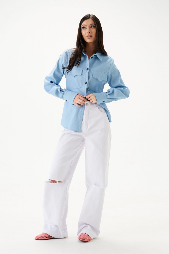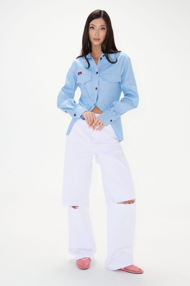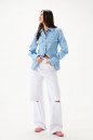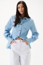 Блузка полуприлегающего силуэта, выполнена из из светло-голубого денима. Характеристики: отложной воротник-стойка, застежка центральная на петли пуговицы, карманы по передней части изделия с клапанами, над карманом нашивка "ANNETE". Талиевые вытачки по переду и спинке изделия. Втачной рукав, немного спущен, по низу рукава манжета на пуговицах, низ изделия с плавным срезом. Длина по спинке 63 см, длина рукава 60 см.