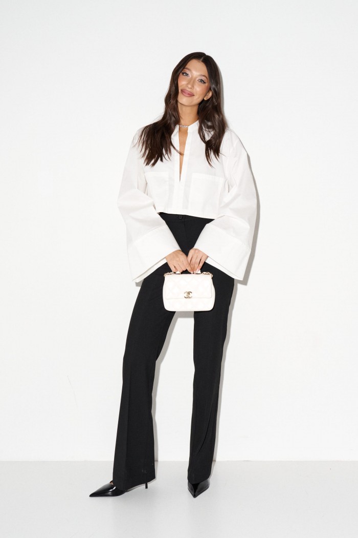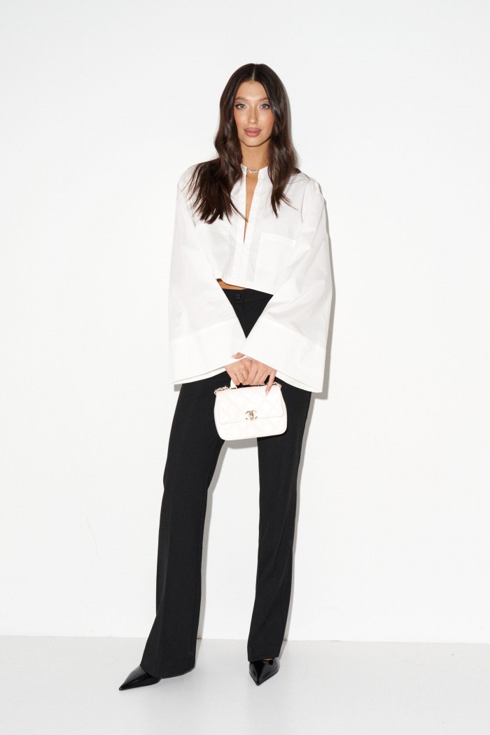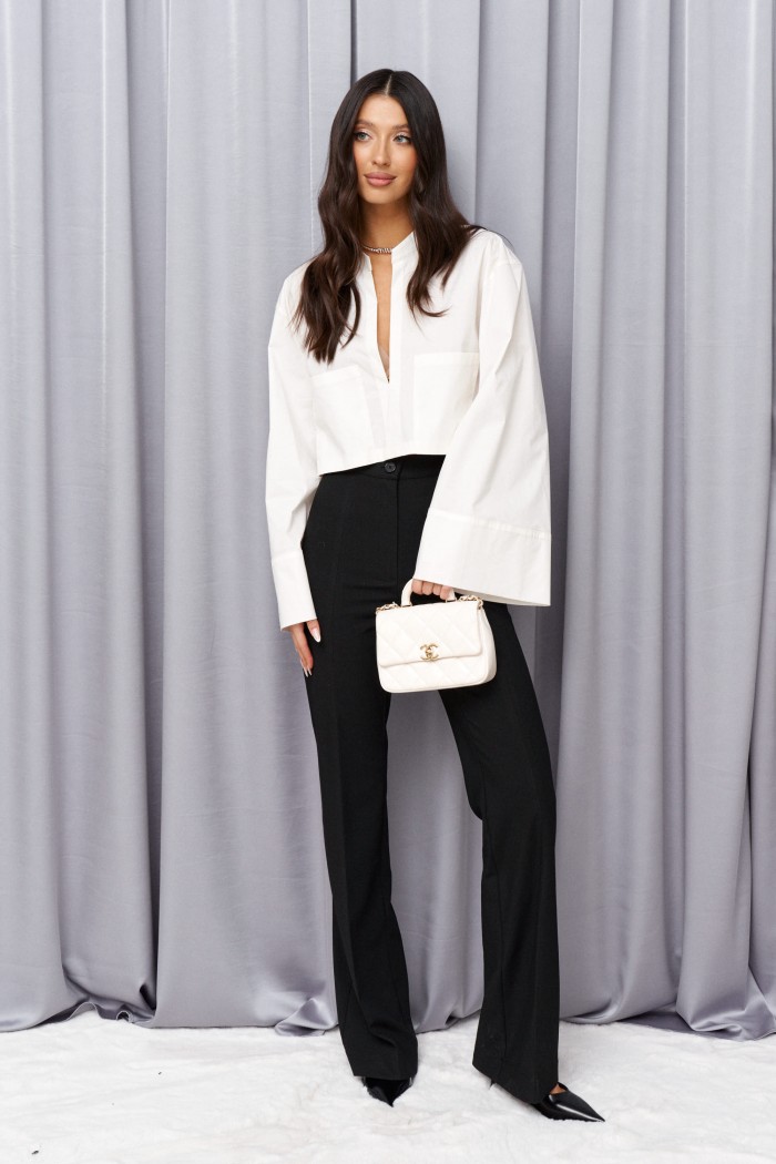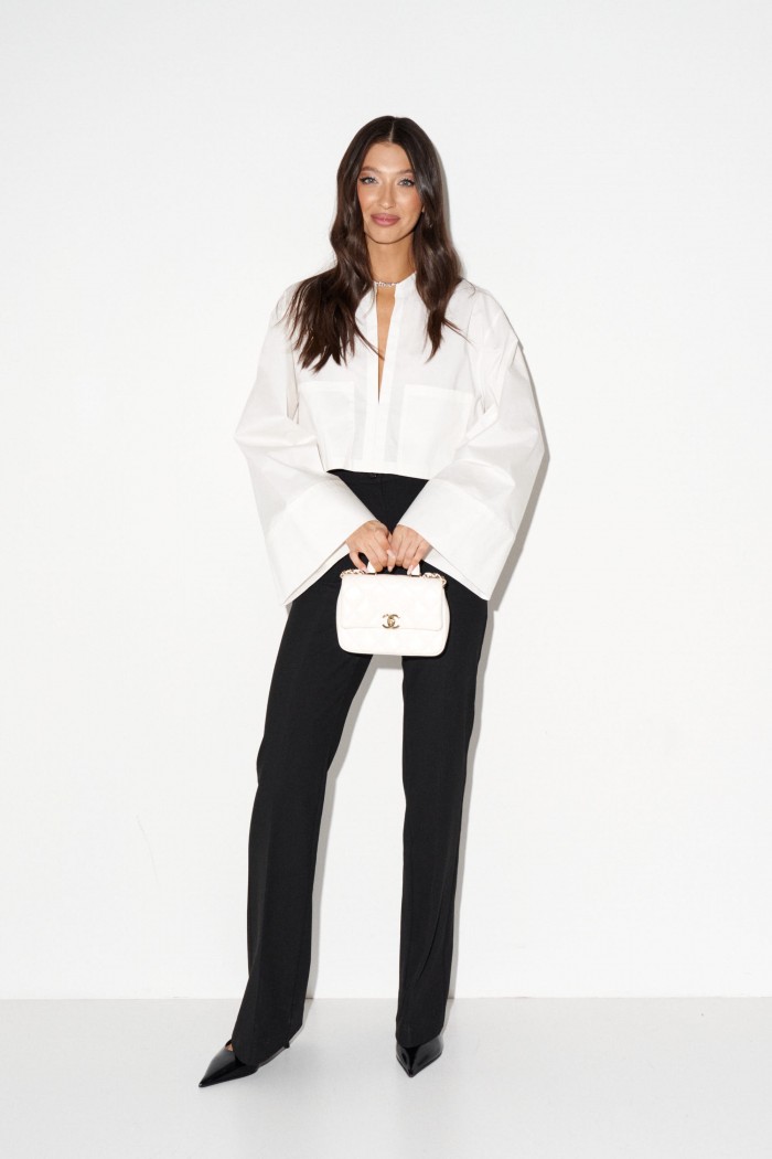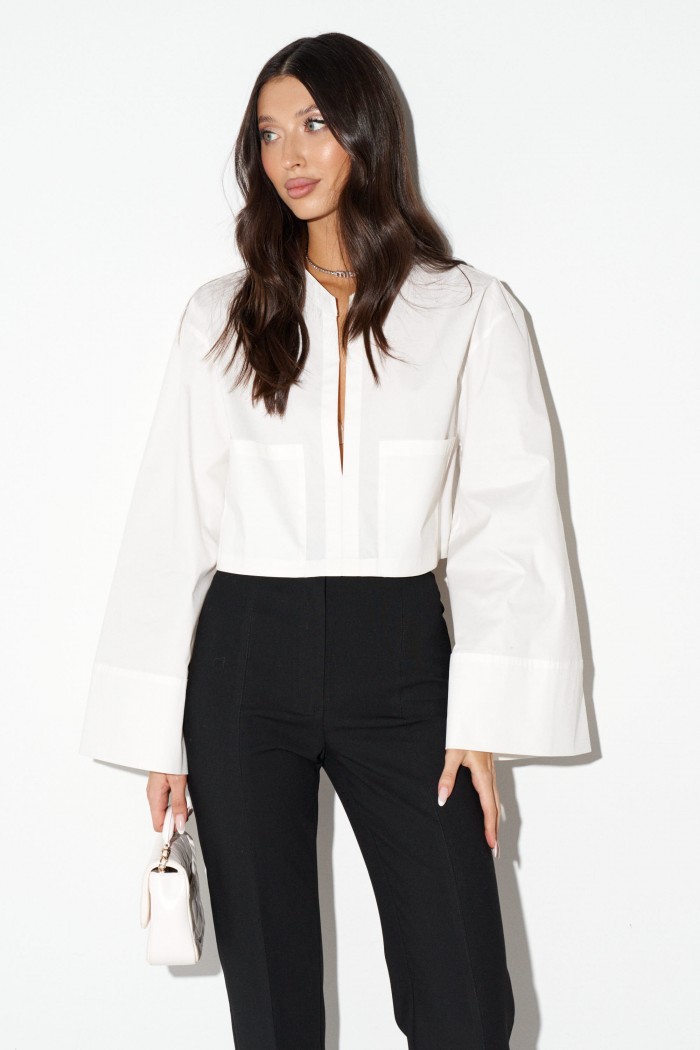 Рубашка прямого свободного кроя выполнена из хлопкового полотна молочного цвета. Характеристики: воротник-стойка, без застежки, рукав свободного кроя - спущен, по низу рукава манжета без пуговиц. Длина рубашки 42 см, длина рукава от края горовины 72 см.