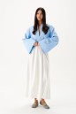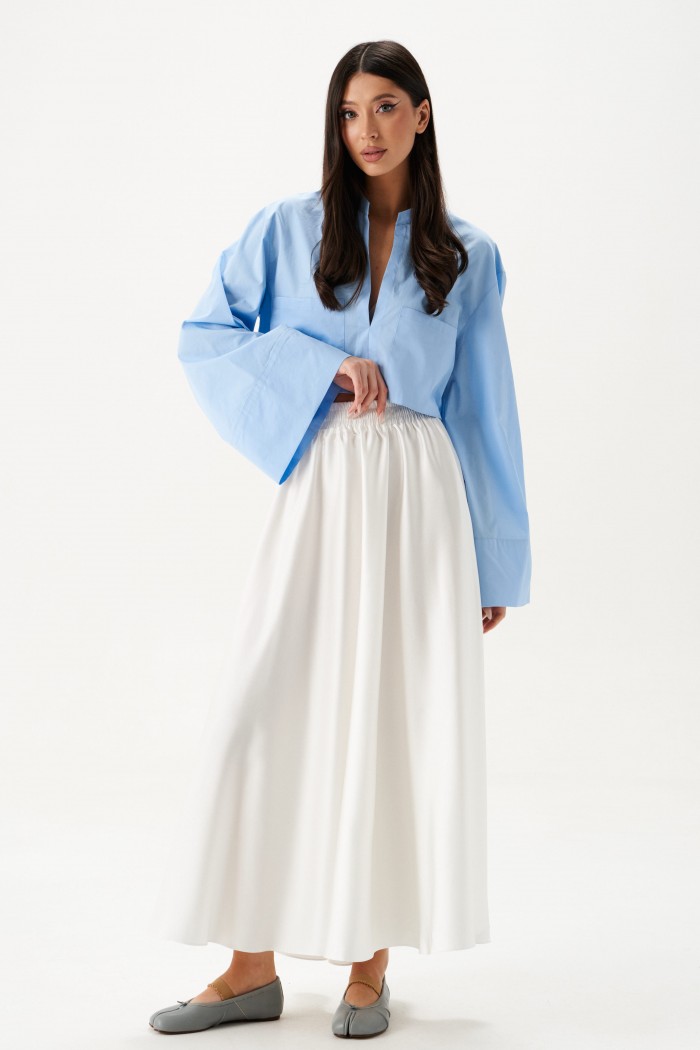Рубашка прямого свободного кроя выполнена из хлопкового полотна голубого цвета. Характеристики: воротник-стойка, без застежки, рукав свободного кроя - спущен, по переду нашиты нефункциональный карманы, по низу рукава манжета без пуговиц. Длина рубашки 42 см, длина рукава от края горовины 72 см.
