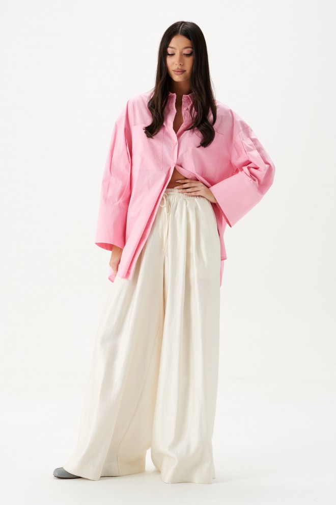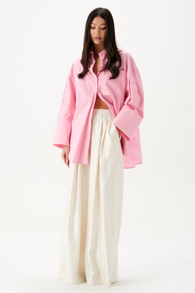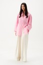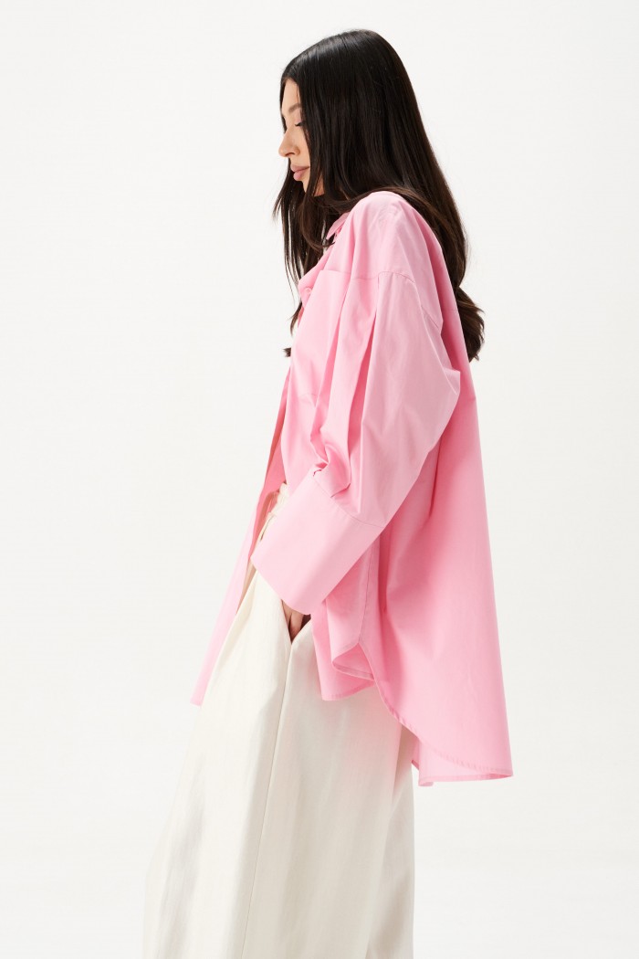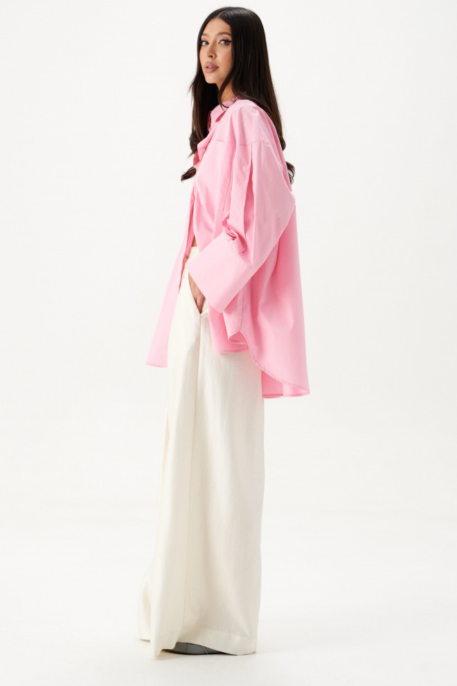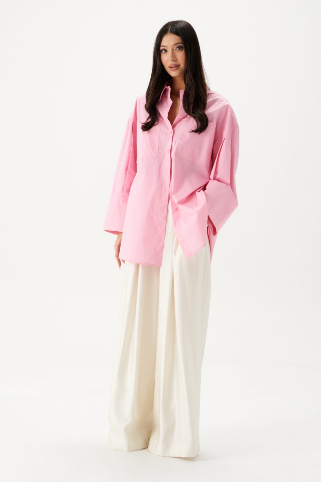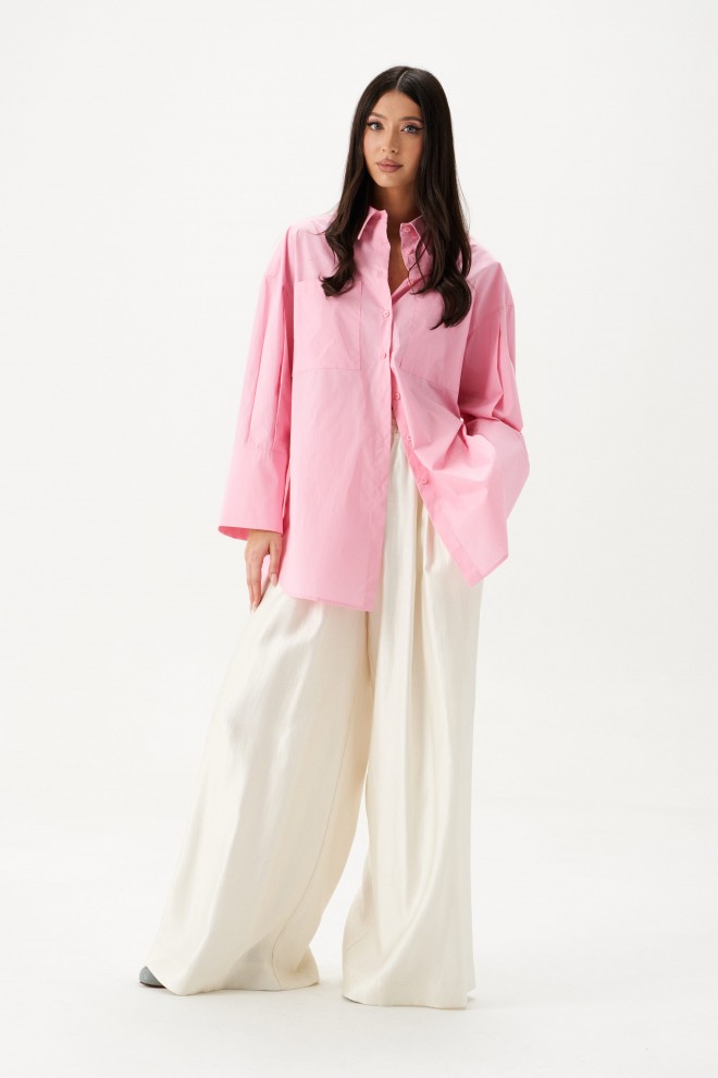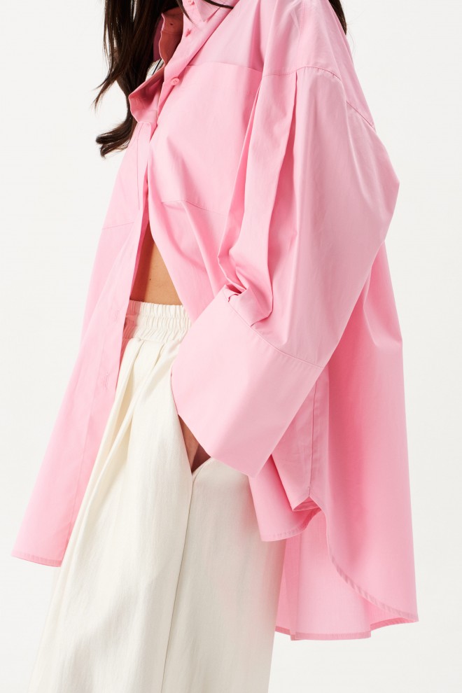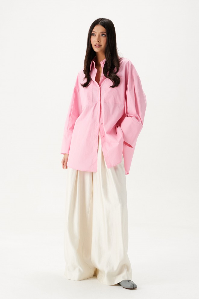 Рубашка прямого свободного кроя выполнена из ткани розового цвета.