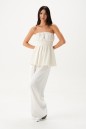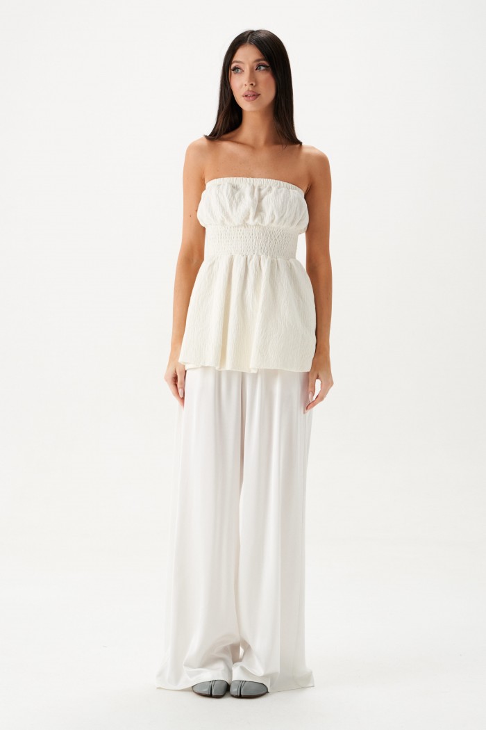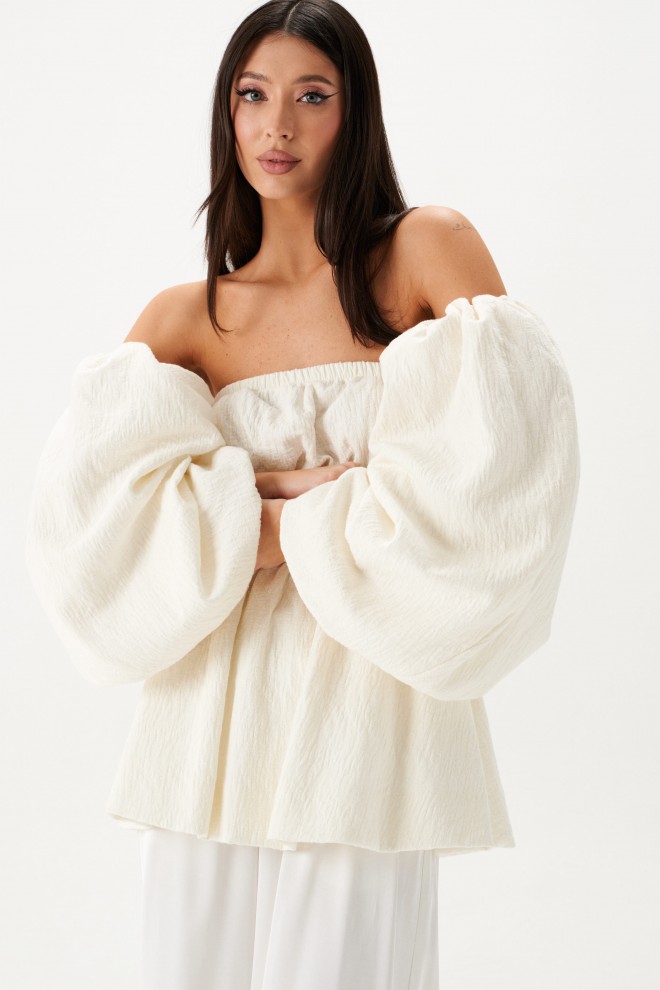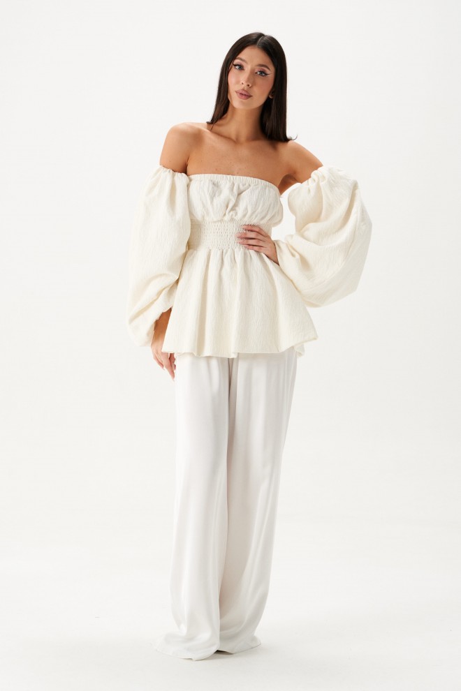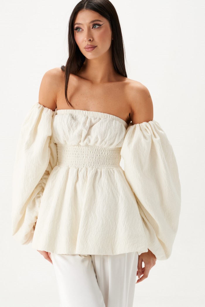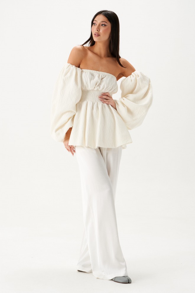 Блуза. Выполнена из двойного муслина молочного цвета. Верхняя часть на резинке. По линии талии широкая венгерка. Низ свободного кроя. Есть подкладка. Рукава-буфы не идут в комплекте. Длина спинки 50 см