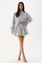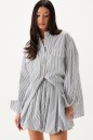 Блузка прямого свободного кроя в полоску. Характеристики: прямой свободный крой, воротник рубашечного типа, застежка центральная на петли пуговички, рукав спущен, по низу рукава широкая манжета на декоративной пуговице, по переду крупные карманы, низ с плавным срезом, внизу по бокам разрезы 18см. Спинка отрезная с декоративной сборкой, длина по спинке 76см, длина рукава от края горловины 83см.