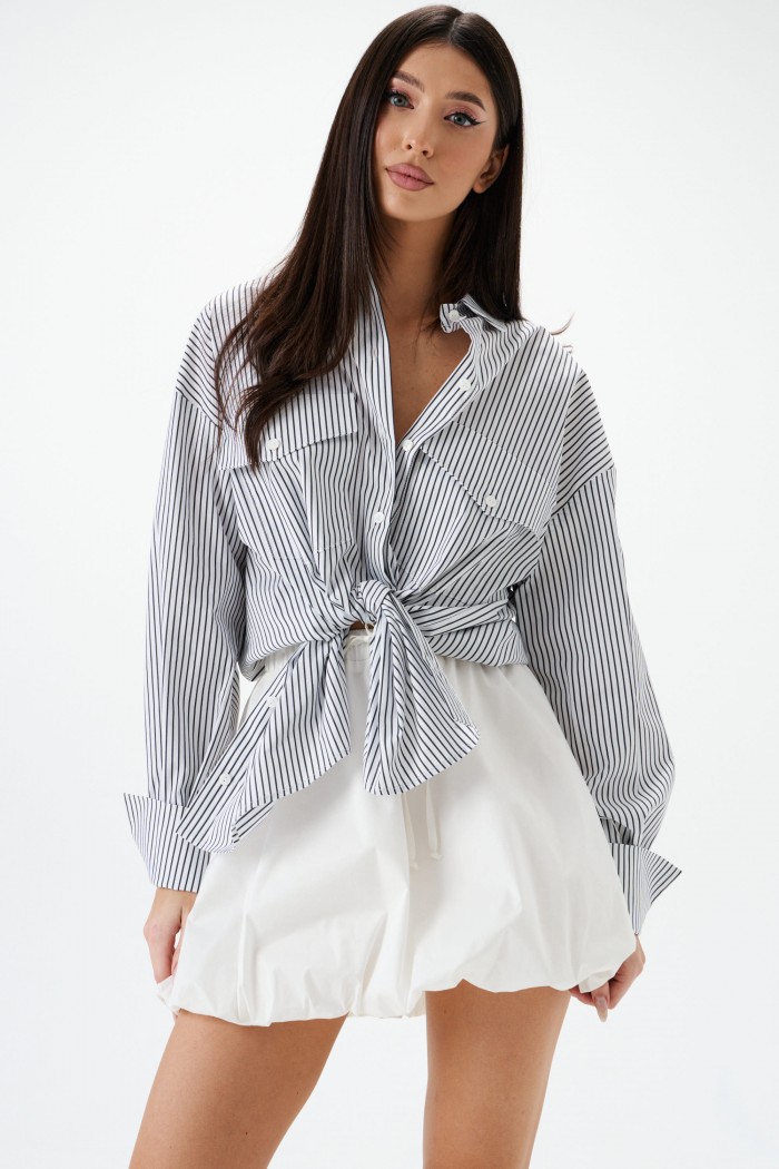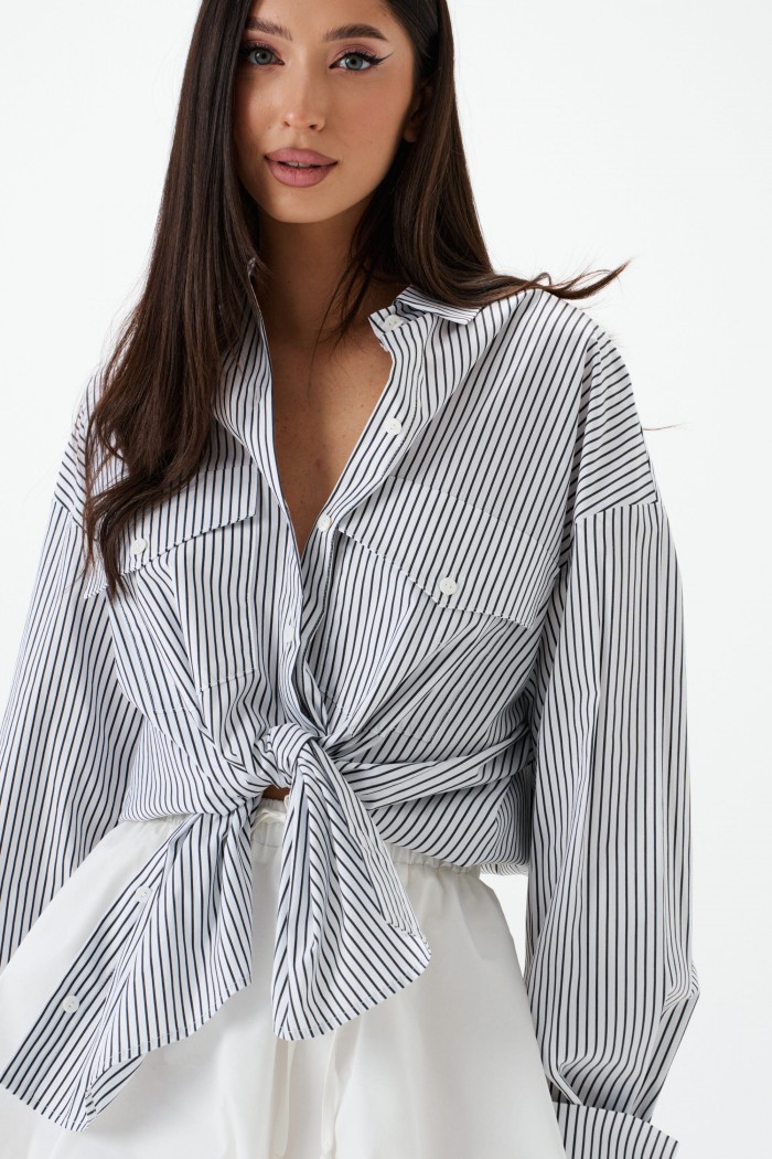Блузка прямого свободного кроя в полоску. Характеристики: прямой свободный крой, воротник рубашечного типа, застежка центральная на петли пуговички, рукав спущен, по низу рукава широкая манжета на декоративной пуговице, по переду крупные карманы, низ с плавным срезом, внизу по бокам разрезы 18см. Спинка отрезная с декоративной сборкой, длина по спинке 76см, длина рукава от края горловины 83см.