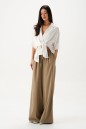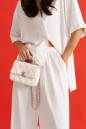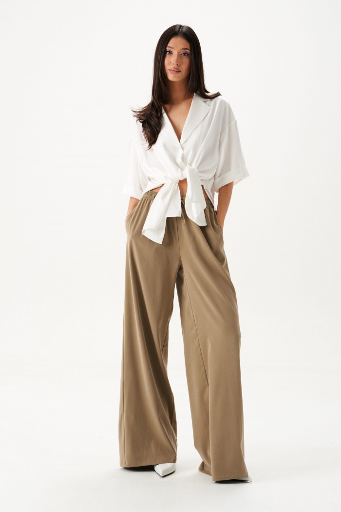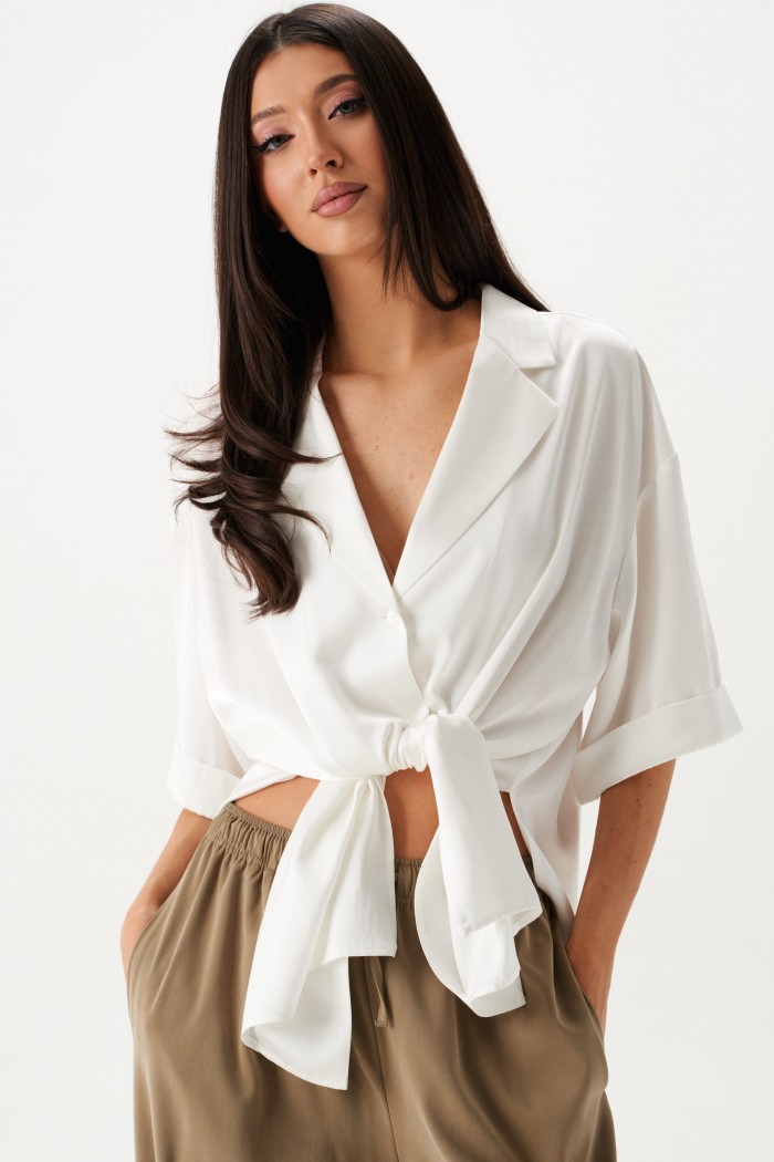 Блузка прямого свободного кроя выполнена из текстильной ткани белого цвета. Характеристики: отложной воротник, застежка центральная на петли пуговицы, спущенная линия плеча, по бокам изделия разрезы 31см, рукав кароткий прямого кроя. Длина рубашки 75 см, длина рукава от края горловины 44см.