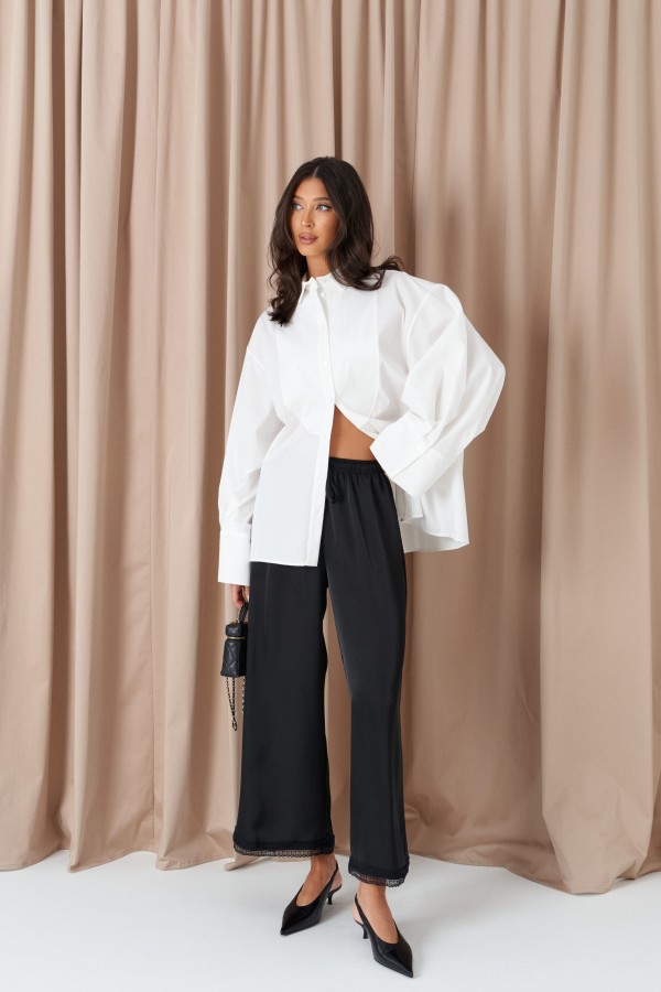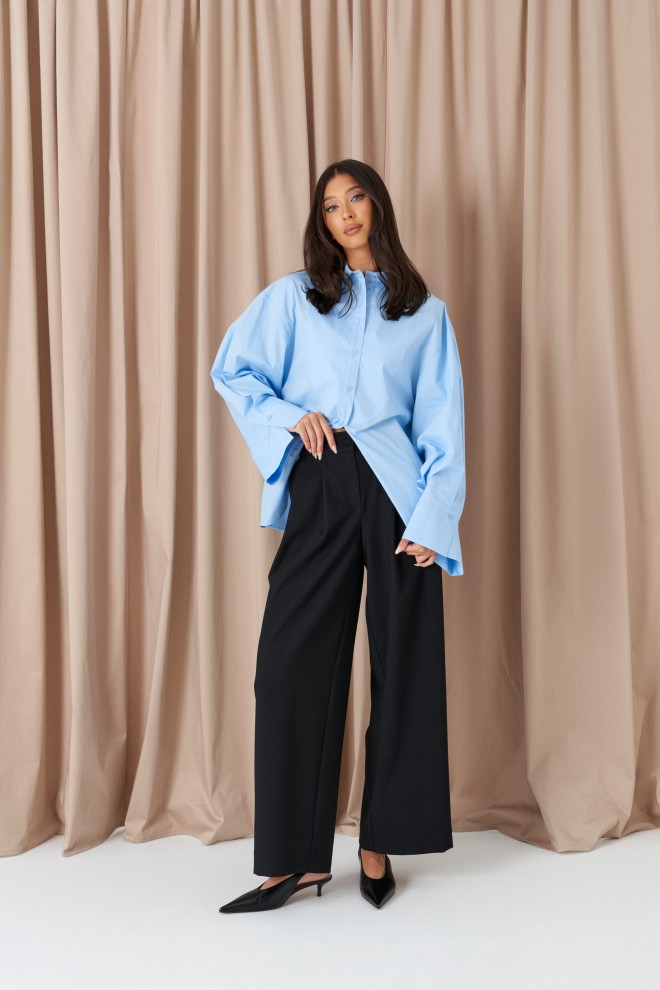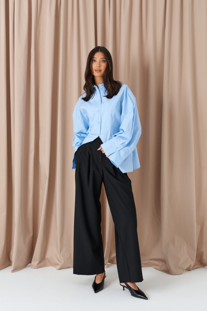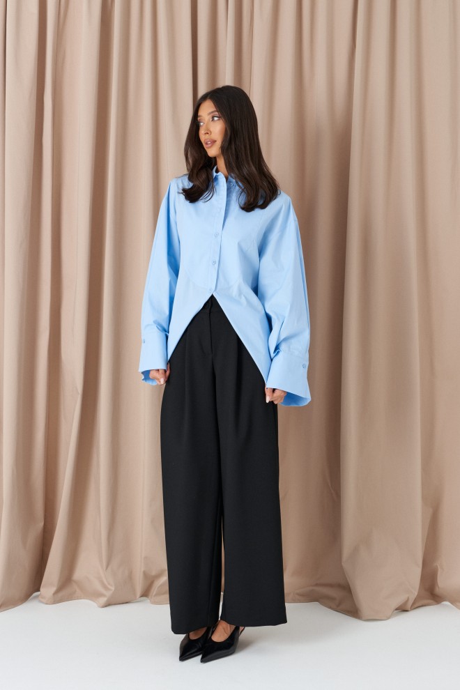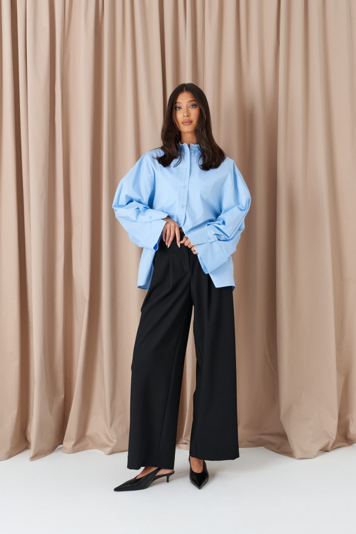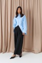 Рубашка прямого кроя, выполнена из ткани голубого цвета. Характеристика: свободный крой, отложной воротник, центральная застежка на пуговицы, по переду фигурная кокетка, рукав втачной, со спущенной линией плеча, с широкой манжетой, на мажете пугвица, отрезная спинка с кокеткой. Длина рукава открая горловин 78см. Длина по спинке 70 см