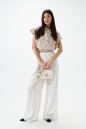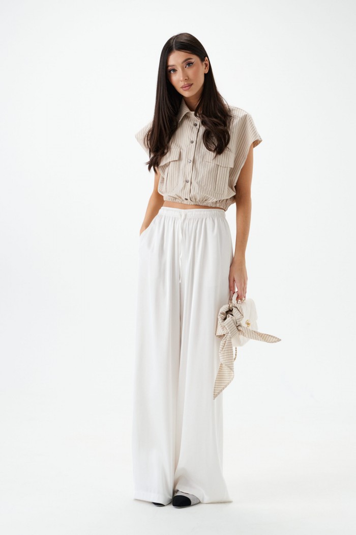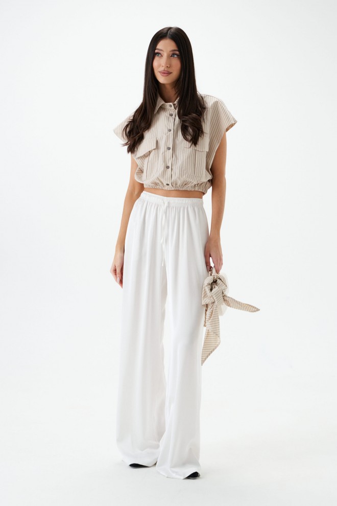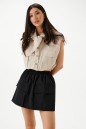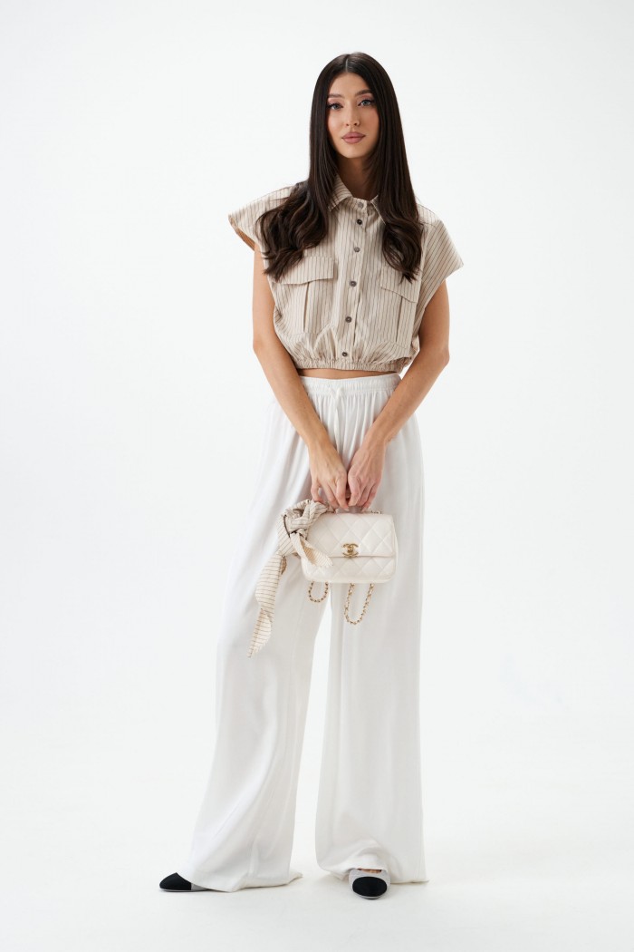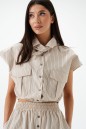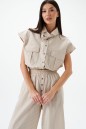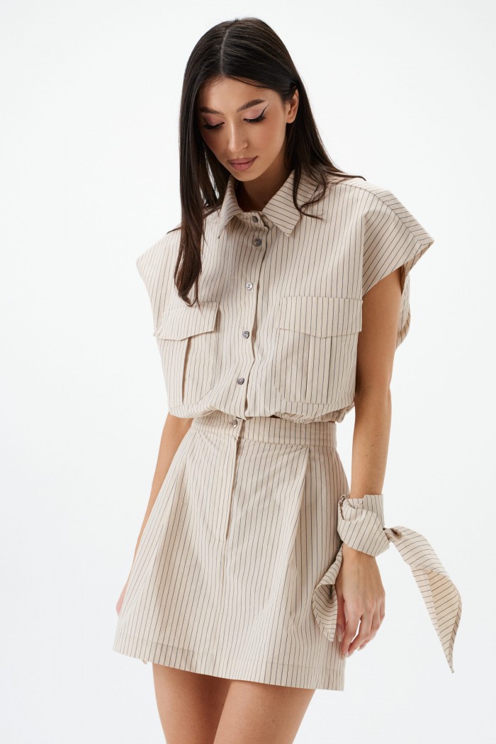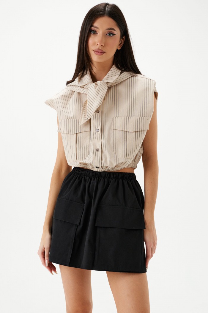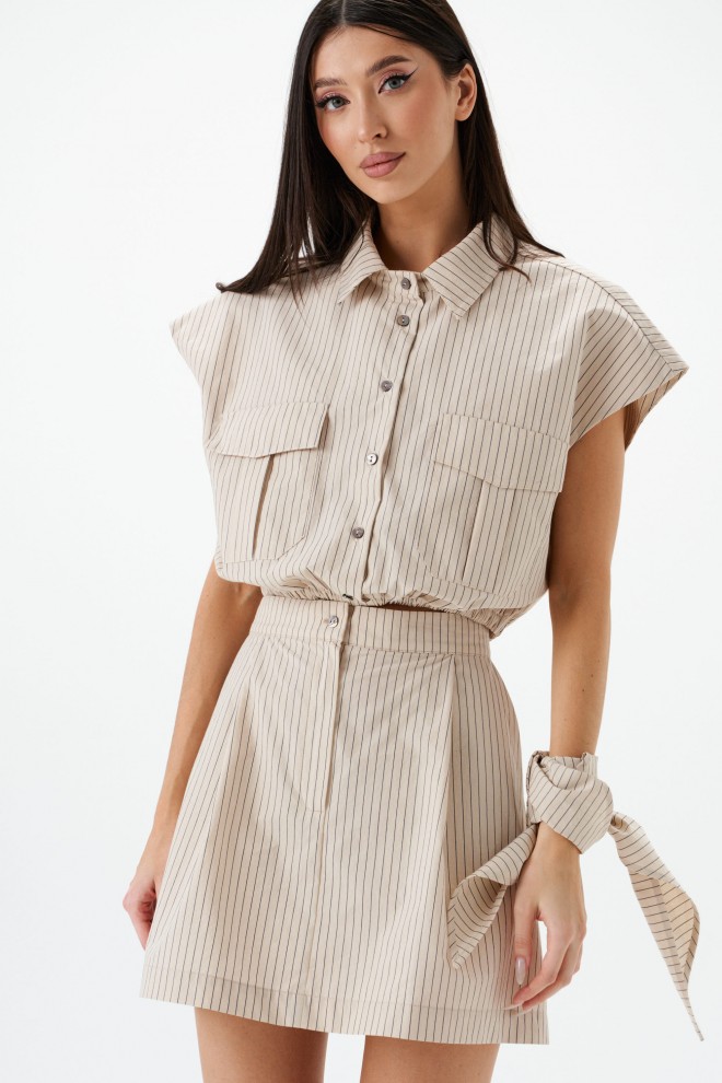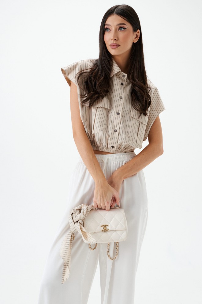Рубашка укороченная, без рукавов выполнена из текстильного полотна бежевого цветв с принтом вертикальная полоска. Характеристики: воротник рубашечного типа, застежка на пуговицы, по переду накладные карманы с клапонами, низ присборен на резинку. В комплект прилагается шарф из основной ткани изделия. Длинна по спинке 46 см.