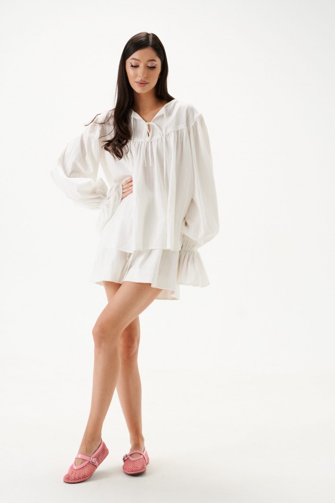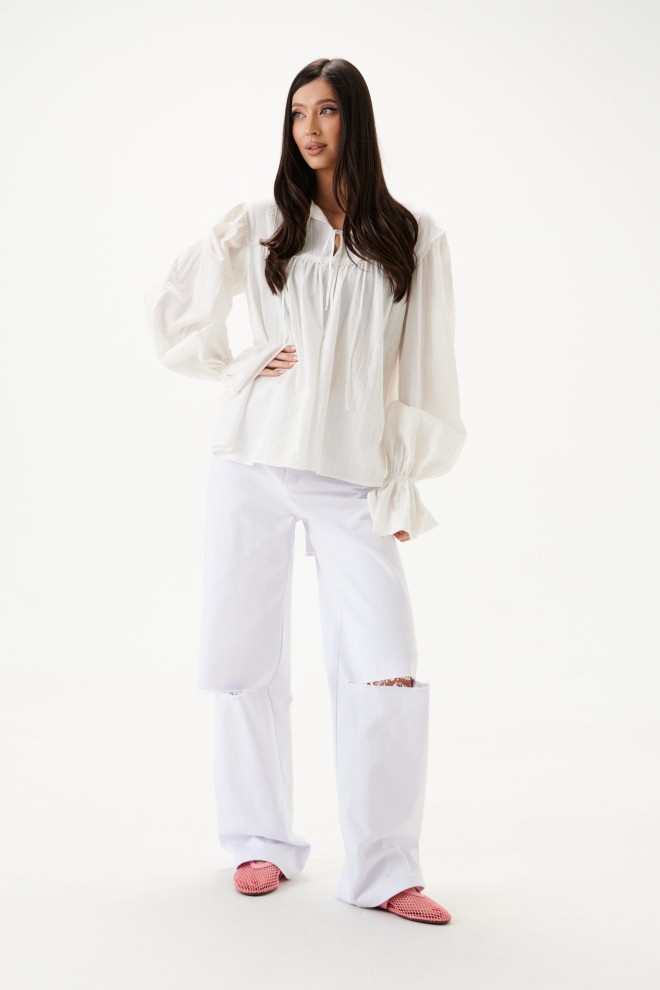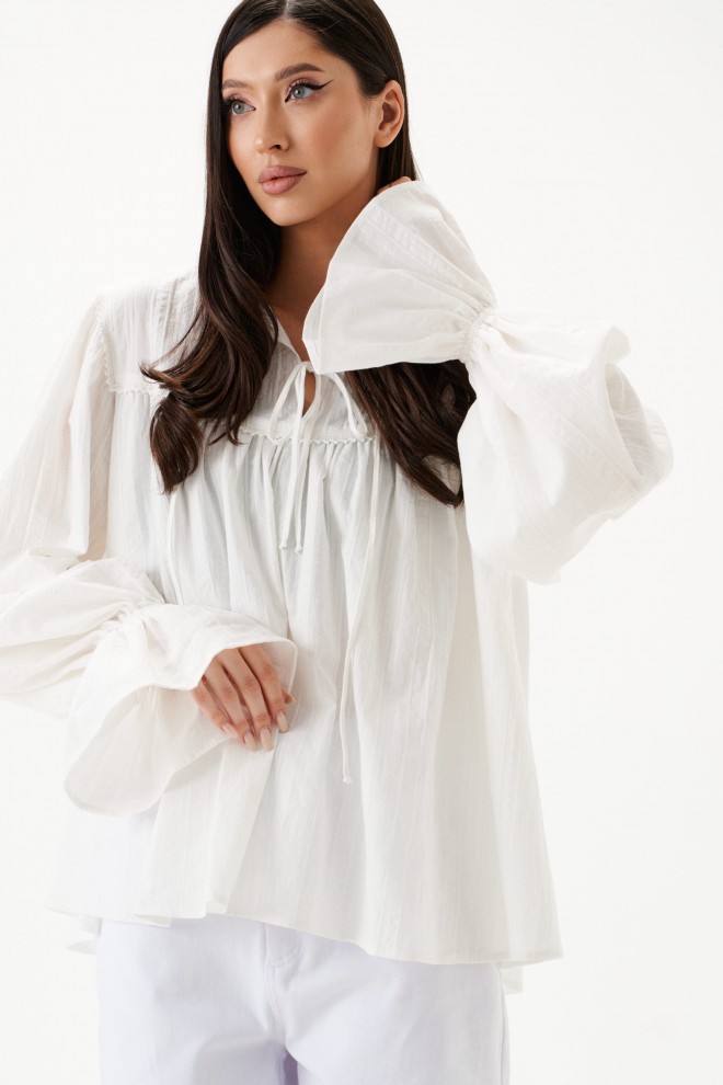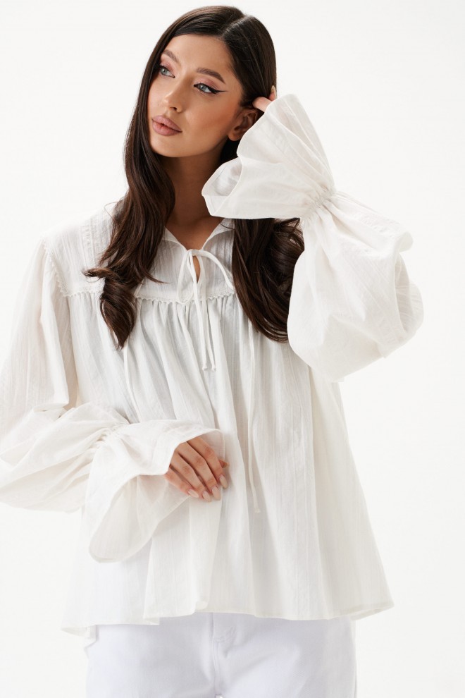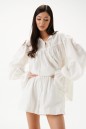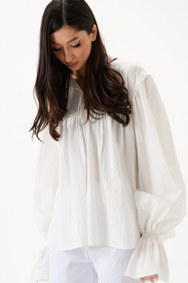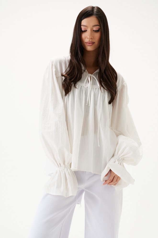 Блуза свободного кроя. Выполнена из хлопкового полотна. По переду и по задней части фигурная кокетка. По переду на кокетке тесьма-завязки (завязки функциональные). Рукав втачной, немного спущен. Низ рукава с резинкой и рюшей. Длина рукава 73 см. Длина спинки 65 см