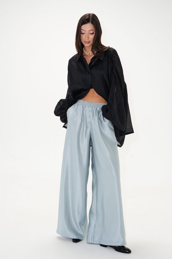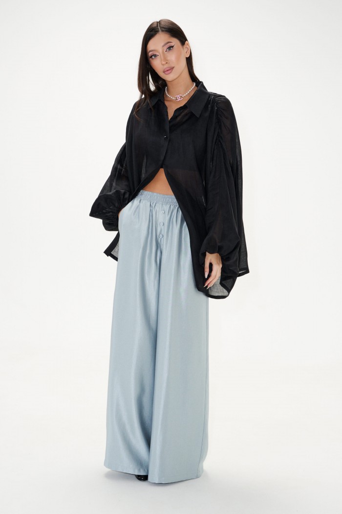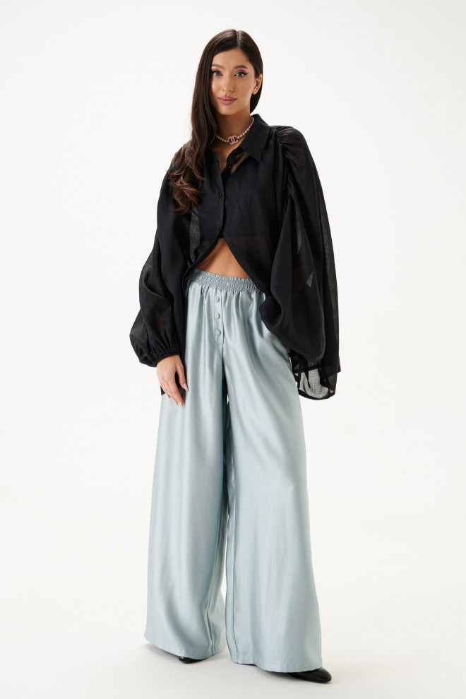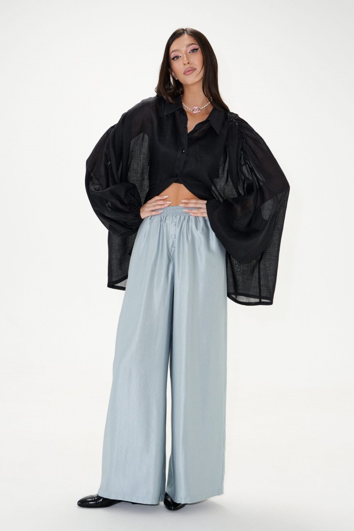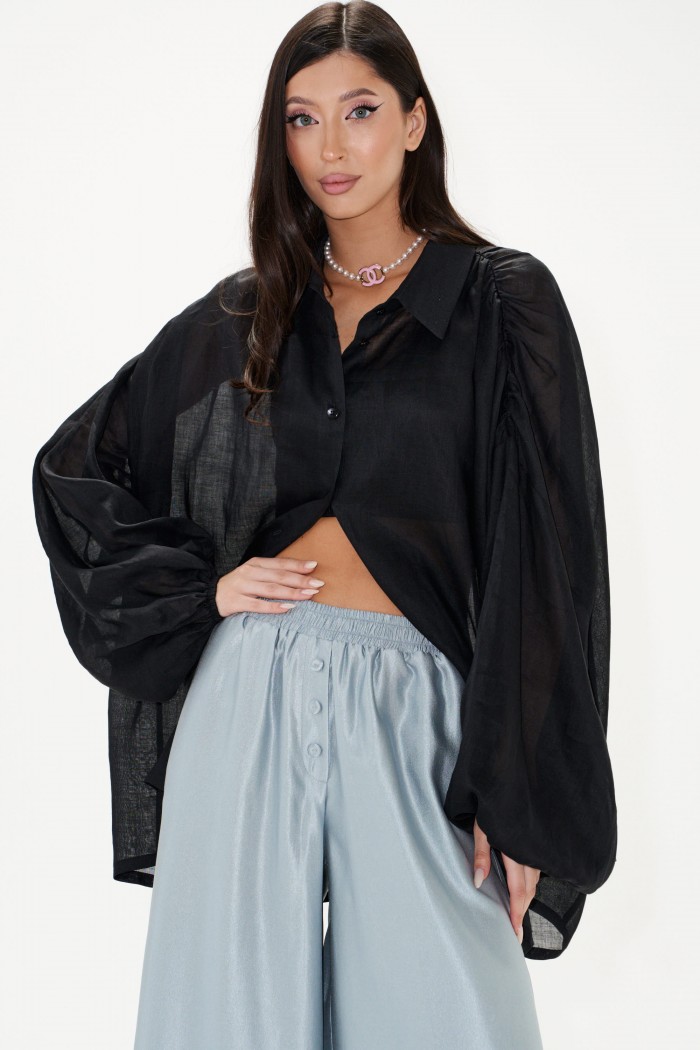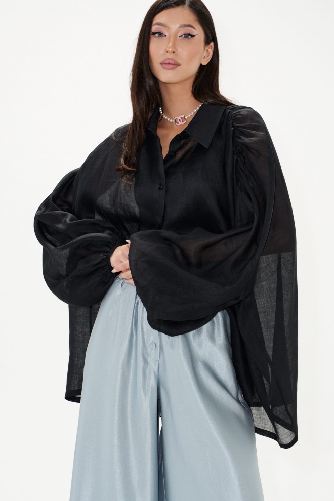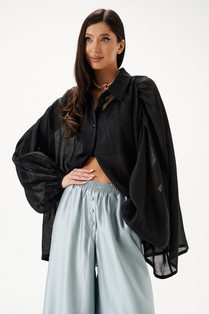 Рубашка свободного кроя. Выполнена из рами. Воротник отложной на стойке. По плечевым швам сборка. Рукав втачной, со спущенной линией плеча, низ на резинке.