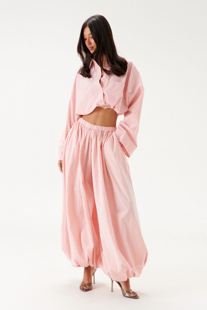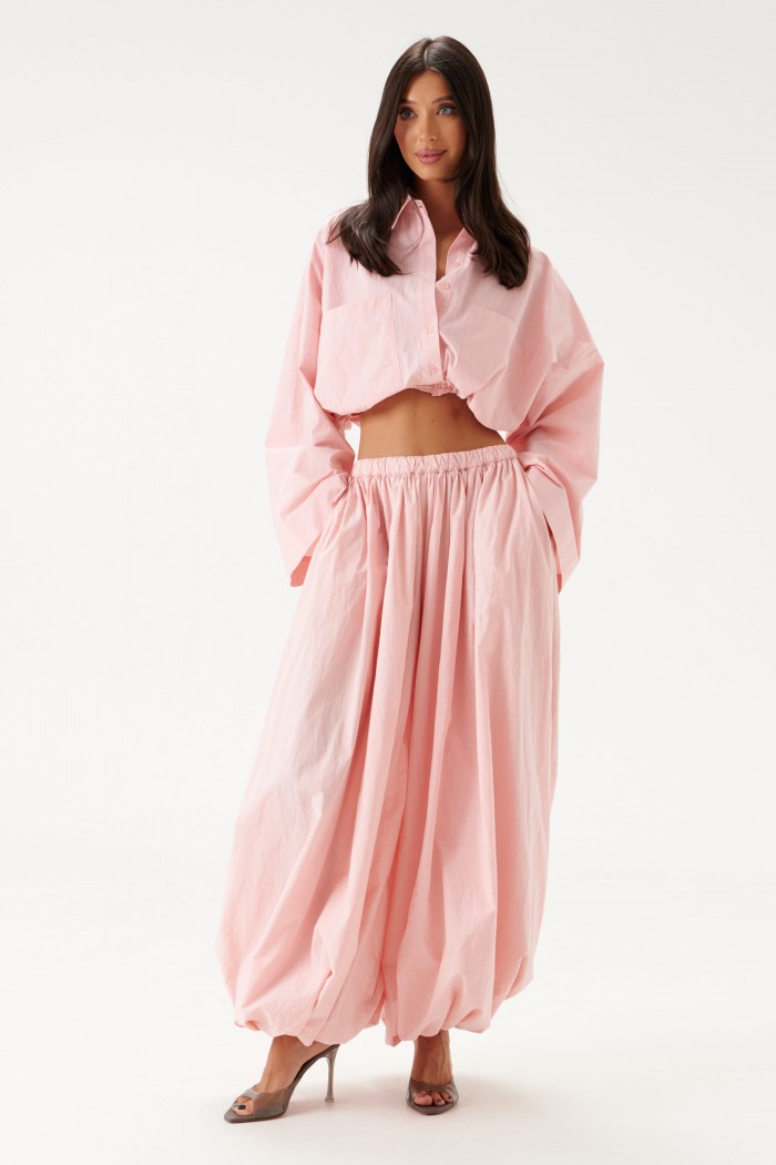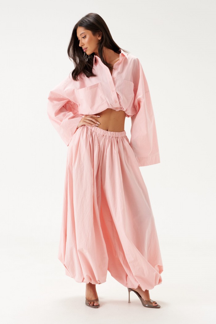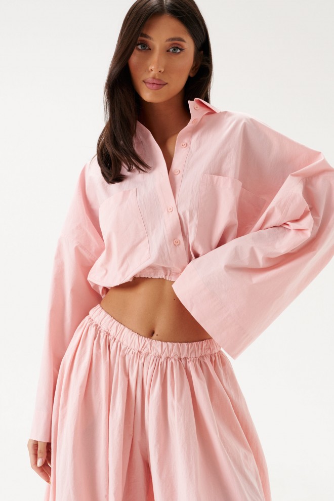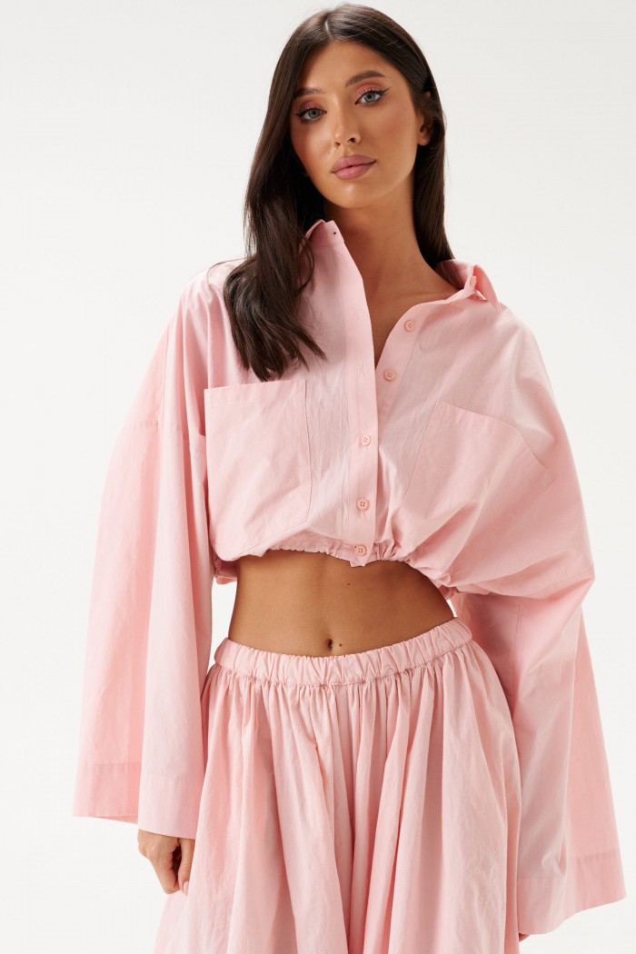 Блузка укороченная, выполнена из хлопкового полотна нежно-розового цвета. Характеристики: воротник рубашечного типа, застежка на пуговицы, по переду функциональные накладные карманы, низ присборен на резинку. Длина по спинке 43 см.