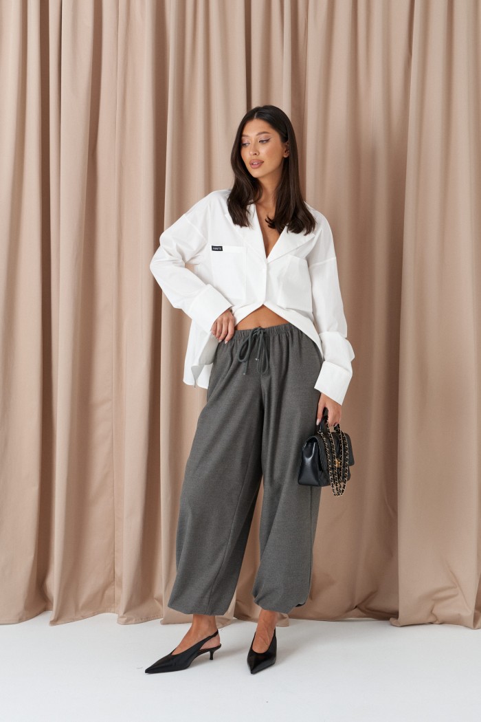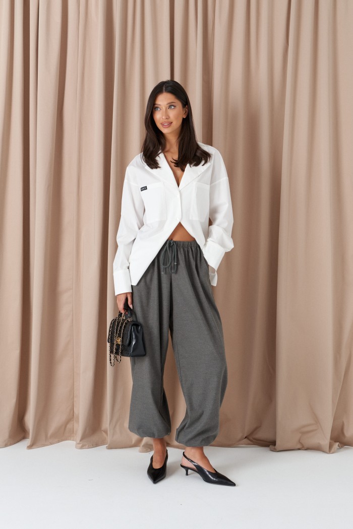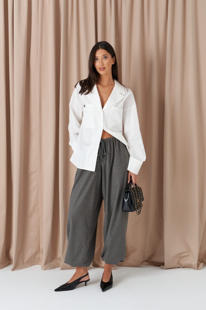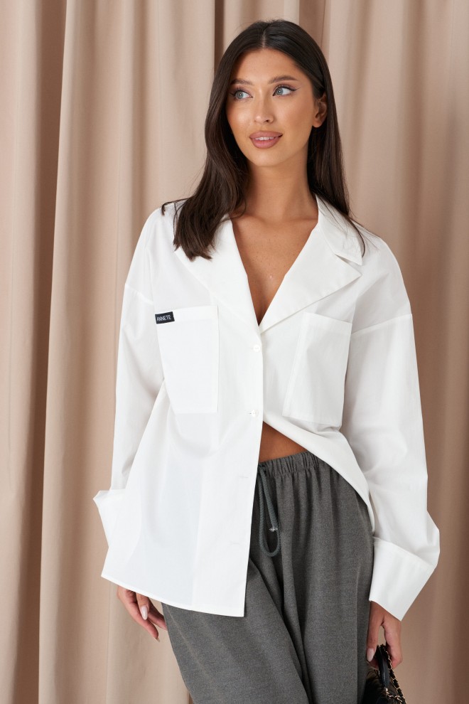 Блузка прямого свободного кроя выполнена из хлопка белого цвета. Характеристики: прямой крой, воротник пиджачного типа, функциональные накладные карманы по переду изделия, разрезы в боковых швах. Рукав втачной, немного спущен, по низу рукава широкий манжет. Длина по спинке 69 см, длина рукава от горловины 76 см
