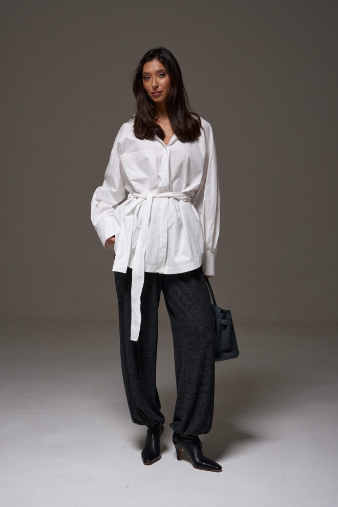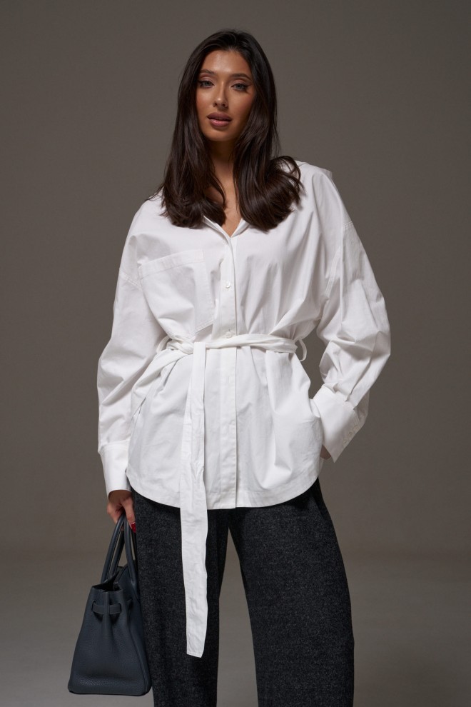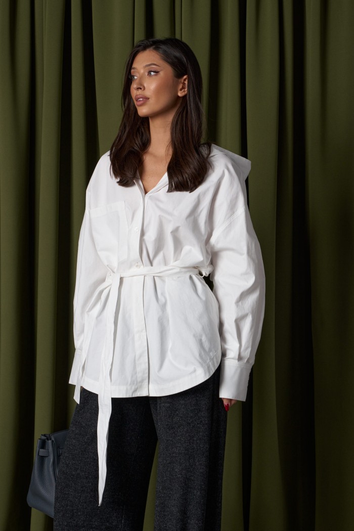 Блузон прямого свободного кроя. Выполнен из хлопокового плотного полотна. Характеристики: прямой свободный крой, рукав спущеный, по линии талии шлевки, пояс в комплекте. Застёжка центральная на пуговицы, по переду изделия один накладной карман. Над манжетом защипы, манжет широкий, застёгивается на три пуговицы. Длина по спинке 75 см, длина рукава от края горловины 77 см.