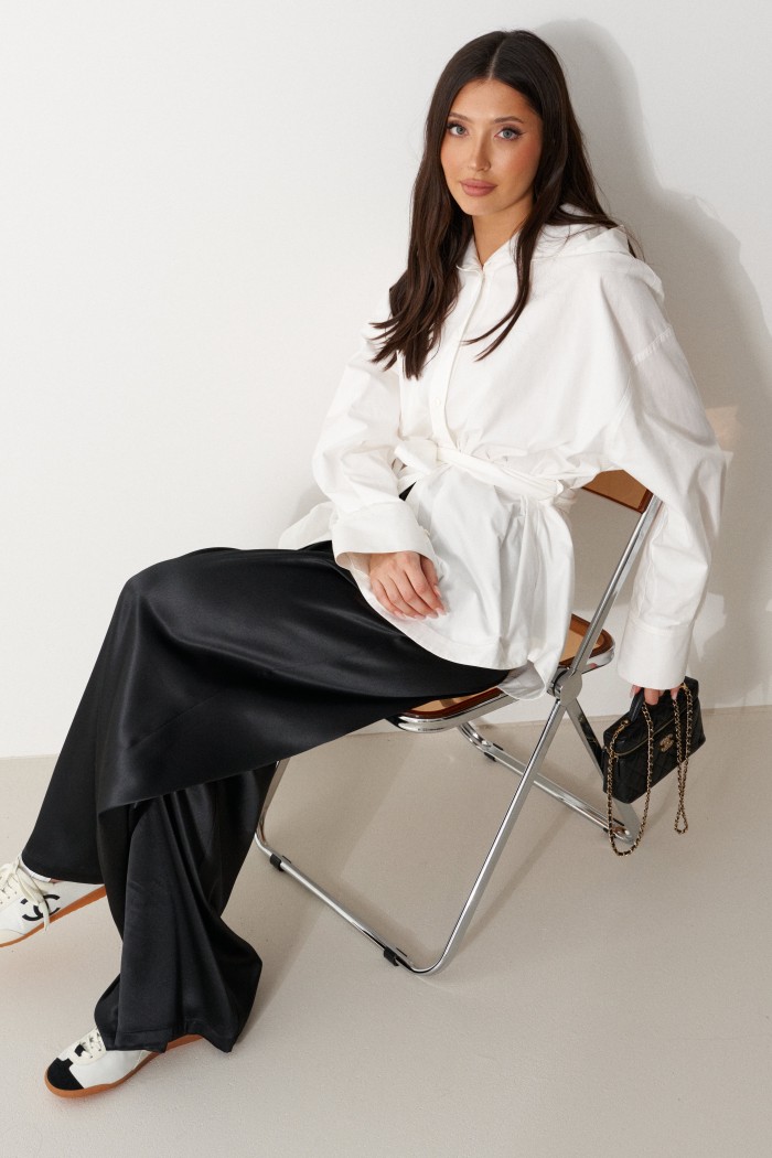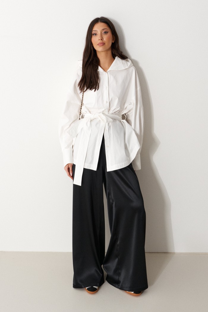 Рубашка прямого свободного кроя. Выполнен из хлопокового плотного полотна. Характеристики: прямой свободный крой, рукав спущеный, по линии талии шлевки, пояс в комплекте. Застёжка центральная на пуговицы, по переду изделия один накладной карман. Над манжетом защипы, манжет широкий, застёгивается на три пуговицы. Длина по спинке 75 см, длина рукава от края горловины 77 см.