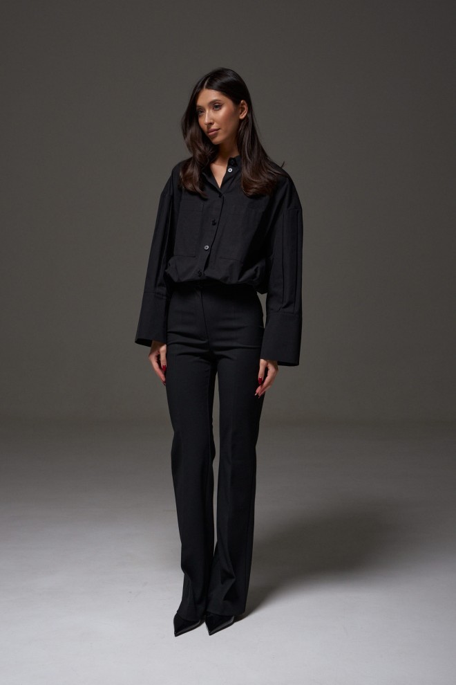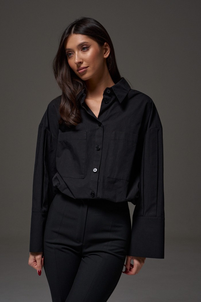 Рубашка прямого свободного кроя выполнена из хлопкового полотная черного цвета. Характеристики: прямой крой, отложной воротник на стойке, застежка центральная на петли пуговицы, по переду крупные карманы, рукав спущен, по рукаву декоративные складки, по низу рукава широкая манжета, спинка отрезная, низ изделия на резинке с фиксатором.