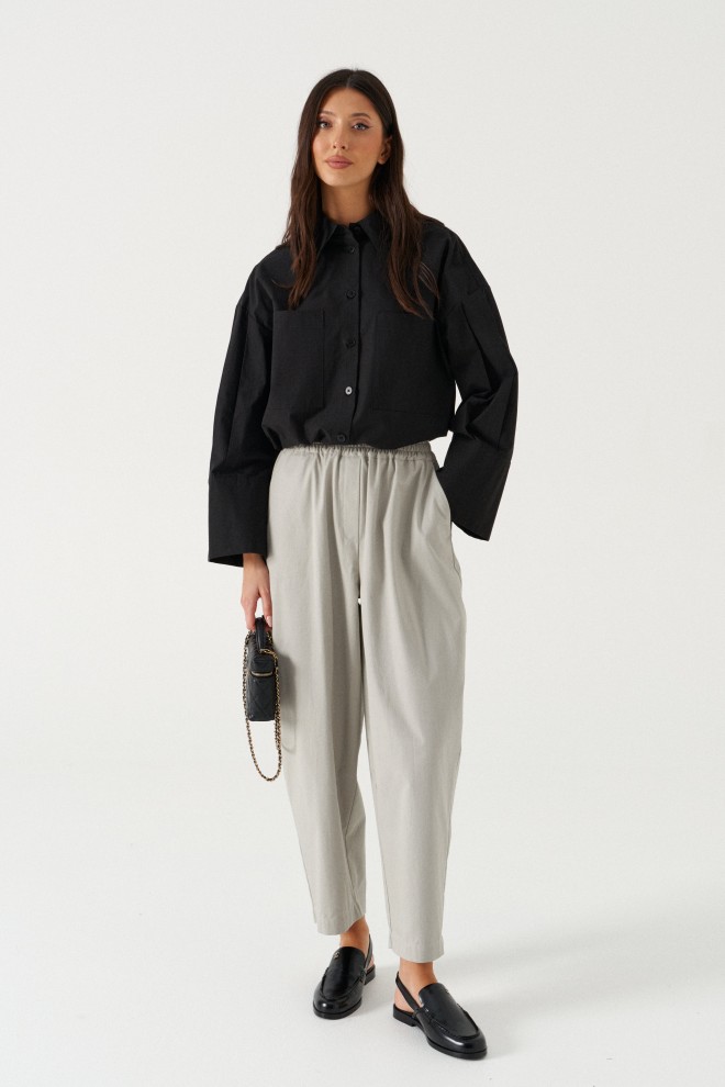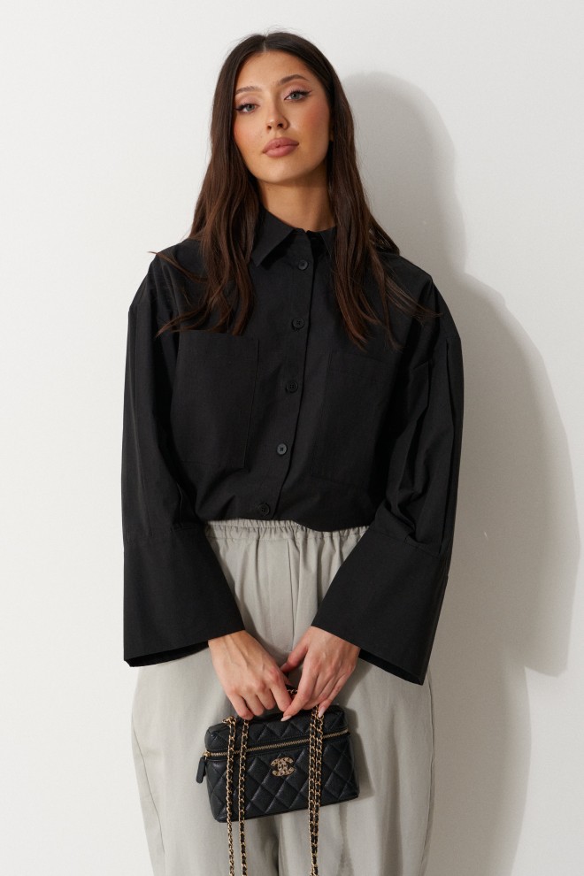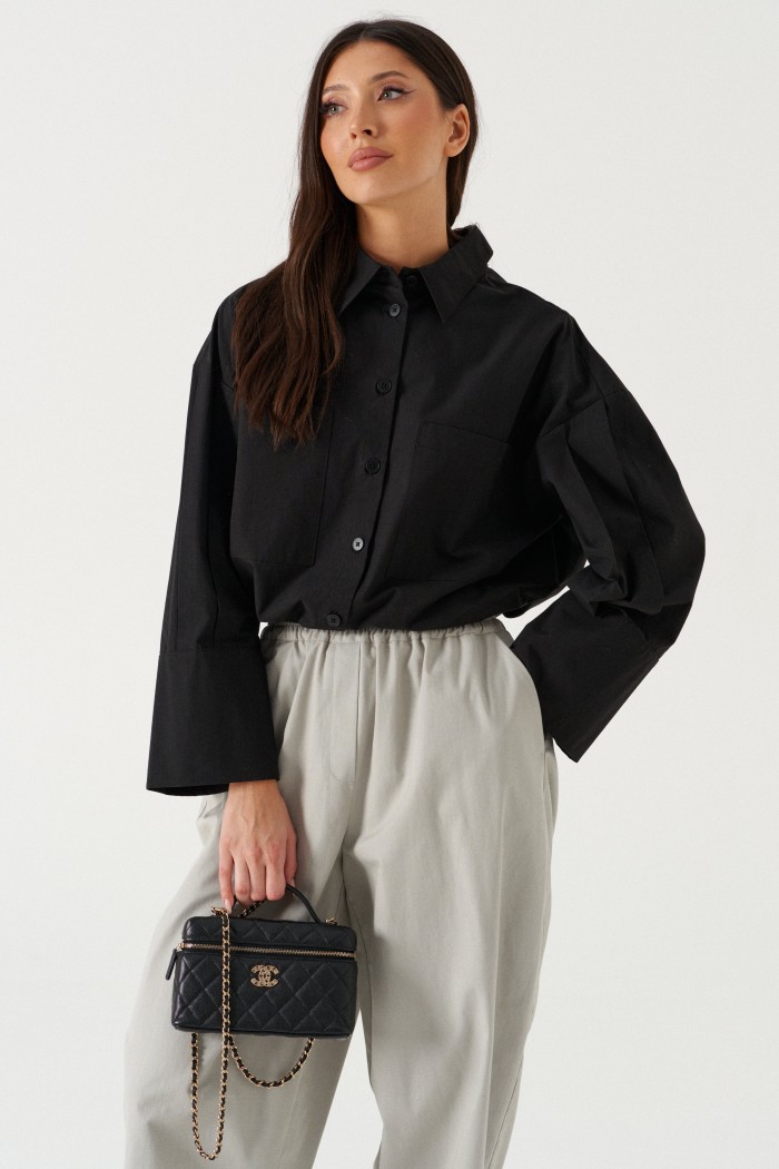 Рубашка прямого свободного кроя выполнена из хлопкового полотная черного цвета. Характеристики: прямой крой, отложной воротник на стойке, застежка центральная на петли пуговицы, по переду крупные карманы, рукав спущен, по рукаву декоративные складки, по низу рукава широкая манжета, спинка отрезная, низ изделия на резинке с фиксатором.