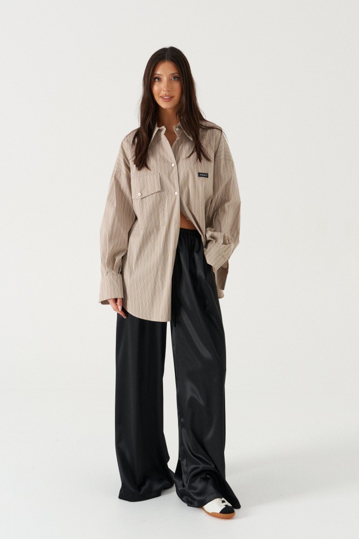 Рубашка прямого свободного кроя, выполнена из полотна цвета капучино в бело-черную полоску. Характеристика: воротник отложной, застёжка центральная на пуговицы, по переду справа на уровне линии груди накладной карман, слева - брендированная нашивка Annete, рукав спущенный свободный, с широкой манжетой на пуговице, спинка отрезная с скоалками. Длина рукава от края горловины 78 см. Длин по центру спинки от края горловины 77 см.