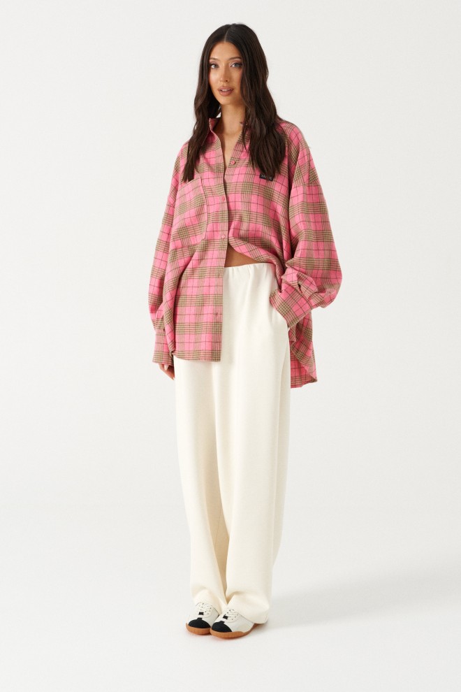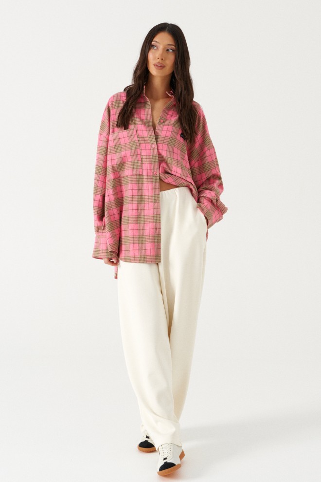 Рубашка прямого свободного кроя, выполнена из ворсистого полотна розового цвета в коричневую клетку. Характеристика: воротник отложной, застёжка центральная на пуговицы, по переду справа на уровне линии груди карман, слева - брендированная нашивка Annete, рукав спущенный свободный, с широкой манжетой на пуговице, спинка отрезная с скоалками. Длина рукава от края горловины 77 см. Длин по центру спинки от края горловины 77 см.