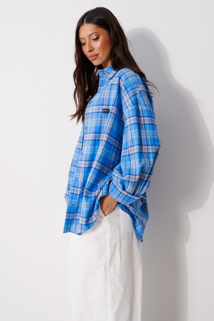 Рубашка прямого свободного кроя, выполнена из ворсистого полотна розового цвета в коричневую клетку. Характеристика: воротник отложной, застёжка центральная на пуговицы, по переду справа на уровне линии груди карман, слева - брендированная нашивка Annete, рукав спущенный свободный, с широкой манжетой на пуговице, спинка отрезная с скоалками. Длина рукава от края горловины 77 см. Длин по центру спинки от края горловины 77 см.