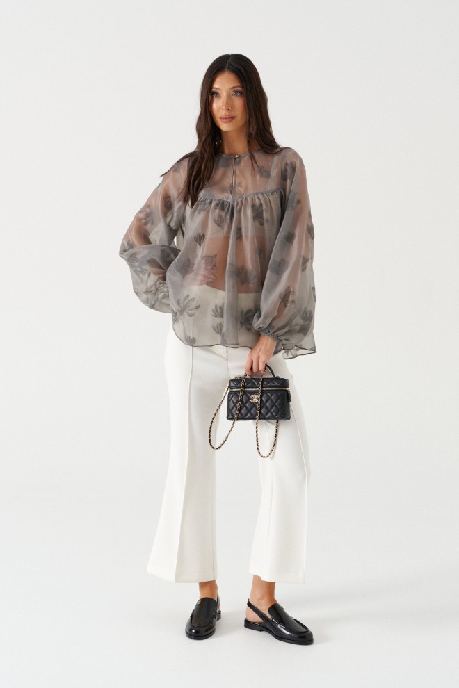 Блуза свободного кроя. Выполнена из прозрачной ткани серого цвета. Горловина круглая. Рукав втачной, внизу на резинке. Застёжка центральная - пуговка. Спинка и передняя части отрезные со сборкой. Длина рукава от линии втачивания 66 см. Длина спинки 67 см