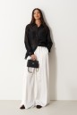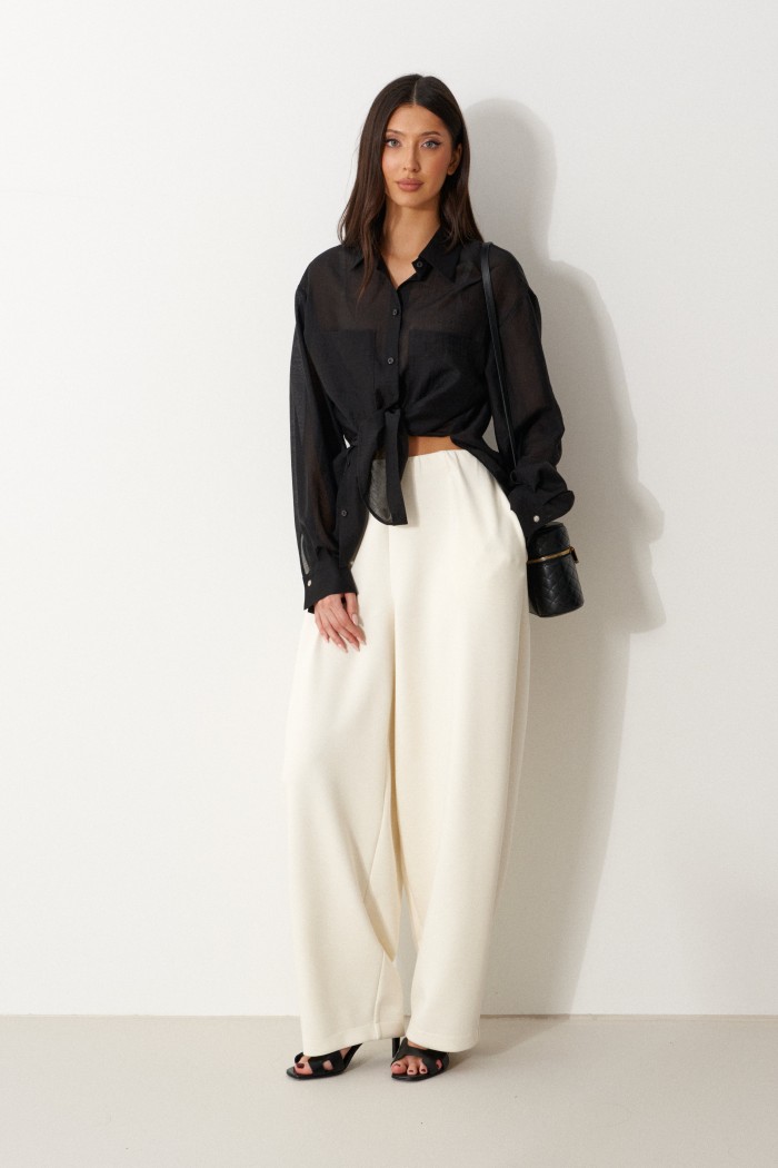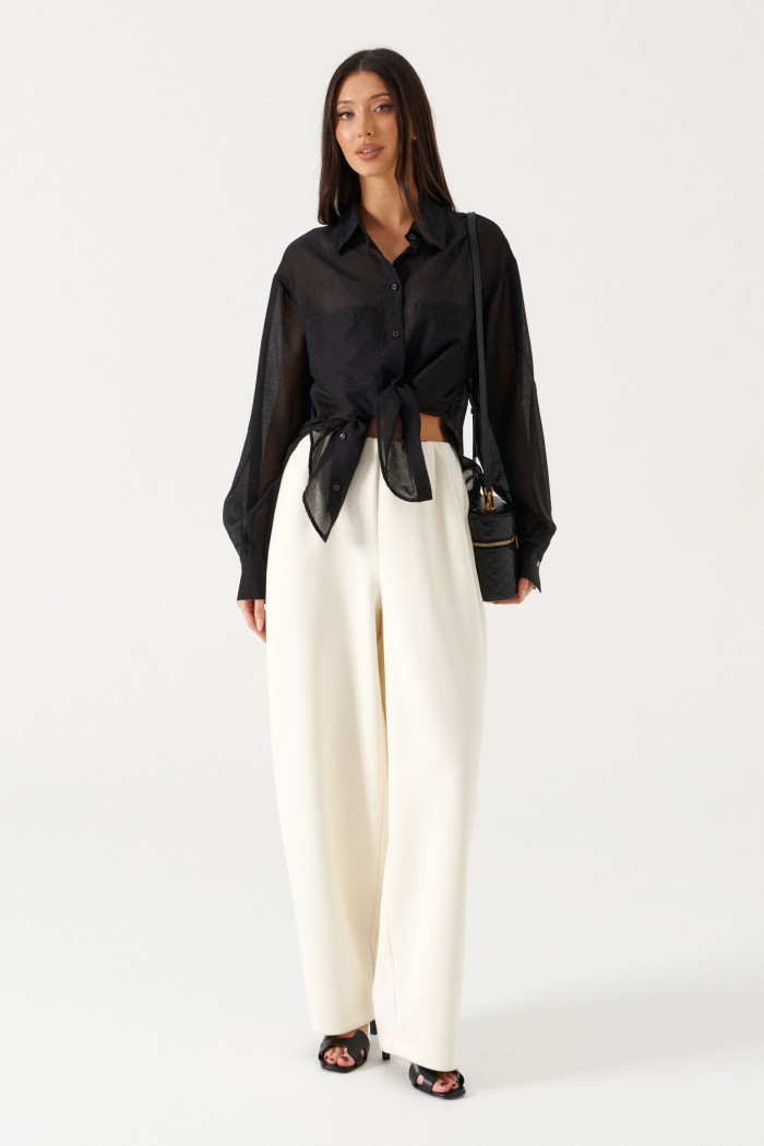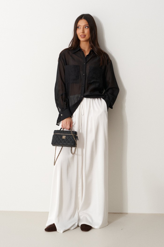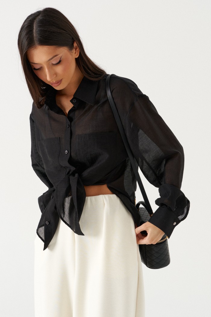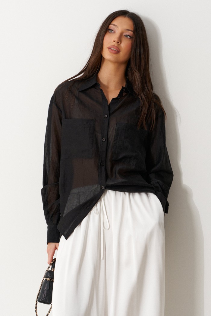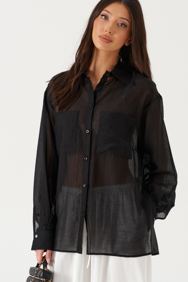 Блузка женская прямого силуэта, свободного облегания. Выполнена из черного полупрозрачного полотна. Характеристика: Воротник отложной на стойке. Рукав одношовный, втачной, со спущенной линией плеча. На переде по линии груди настрочены прямоугольные накладные карманы. Спинка цельная. В боковых швах обработаны разрезы. Застежка центральная, цельнокроеная планка, застегивающаяся на пробивные петли, пришивные пуговицы. На манжетах декоративная пуговица. Длина рукава 60 см, длина плеча 20 см, длина блузы по спинке 69 см.