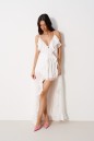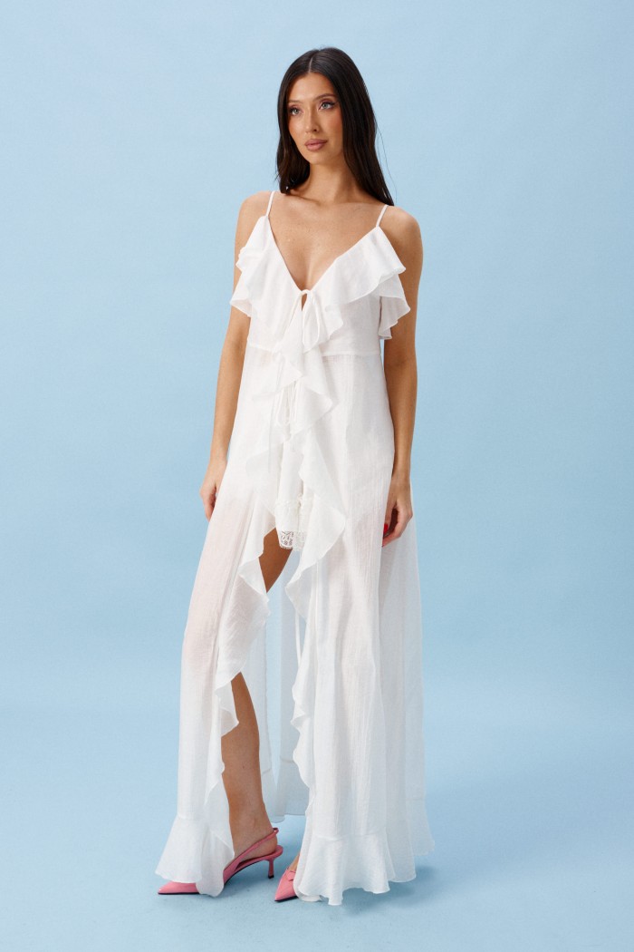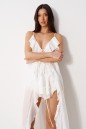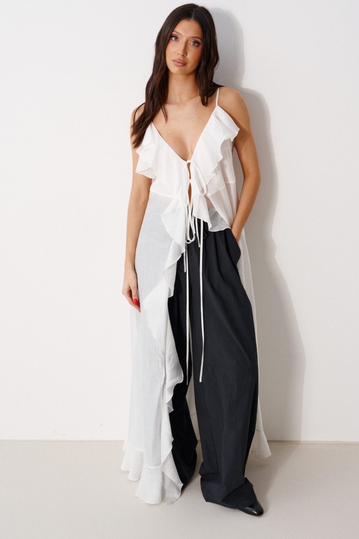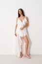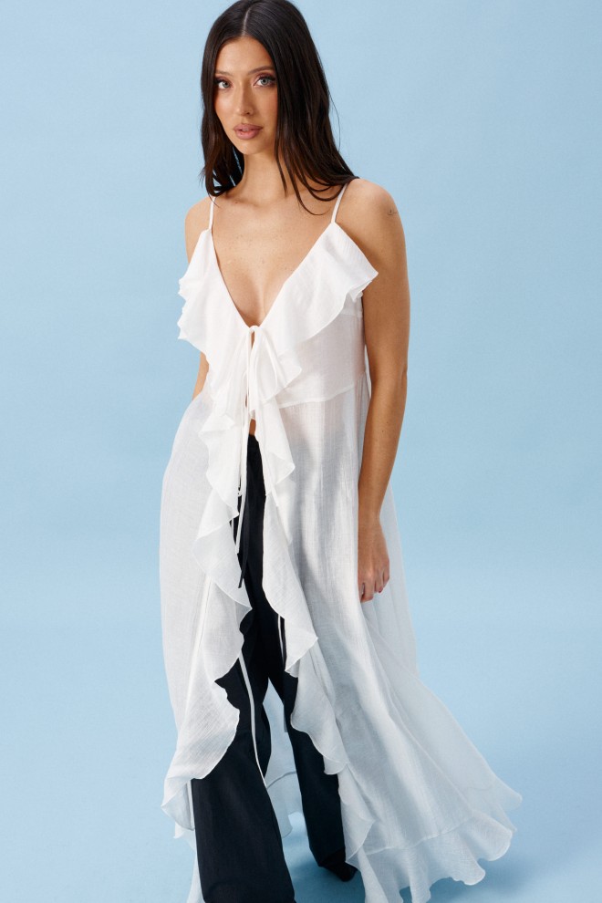 Блуза свободного кроя. Выполнена из мягкой полупрозрачной ткани белого цвета. Вырез горловины V-образный, с завязками. Бретели регулируемые. Двуслойные отрез по линии груди и спинка с отрезной кокеткой. По переду, спинке, низу воланы. Длина спинки 119 см.