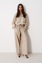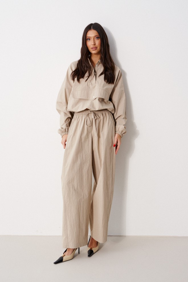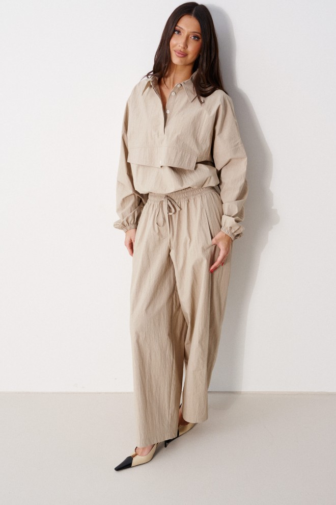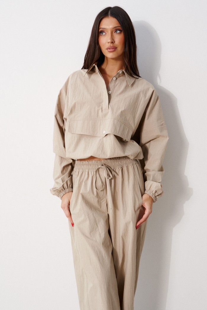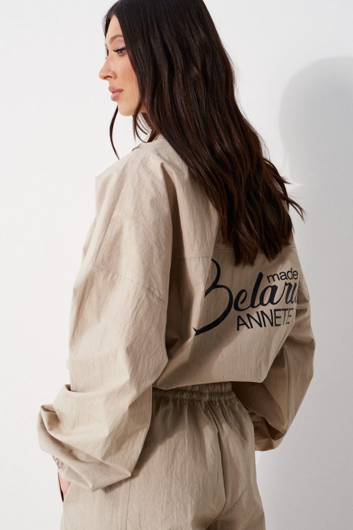 Блузон прямого свободного кроя выполнен из хлопковой ткани, в оттенке светлой оливы. Характеристики: отложной воротник, застежка центральная на петли пуговицы, по переду имитация кармана. Низ изделия на резинке с фиксатором, на спинке расположена надпись "Made in Belarus. Annete". Плечо спущено, рукав свободный, низ рукава на резинке. Длина по спинке 58 см, длина рукава от края горловины 83 см.