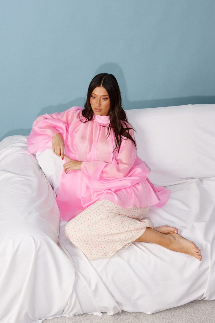 Блузка свободного кроя, выполнена из полупрозрачного полотна розового цвета. Характеристика : свободный крой, воротник стойка сзади на застежке петли пуговицы. Рукав-реглан. Длина рукава от горловины 75см, длина по спинке 74см
