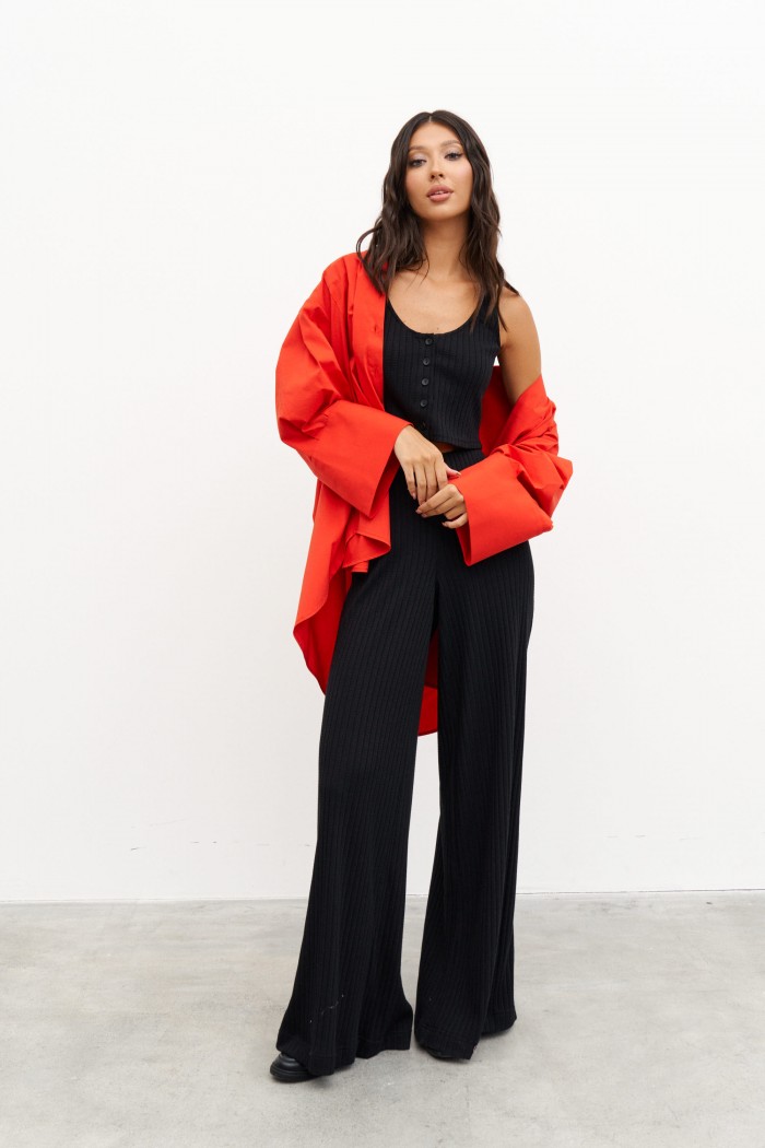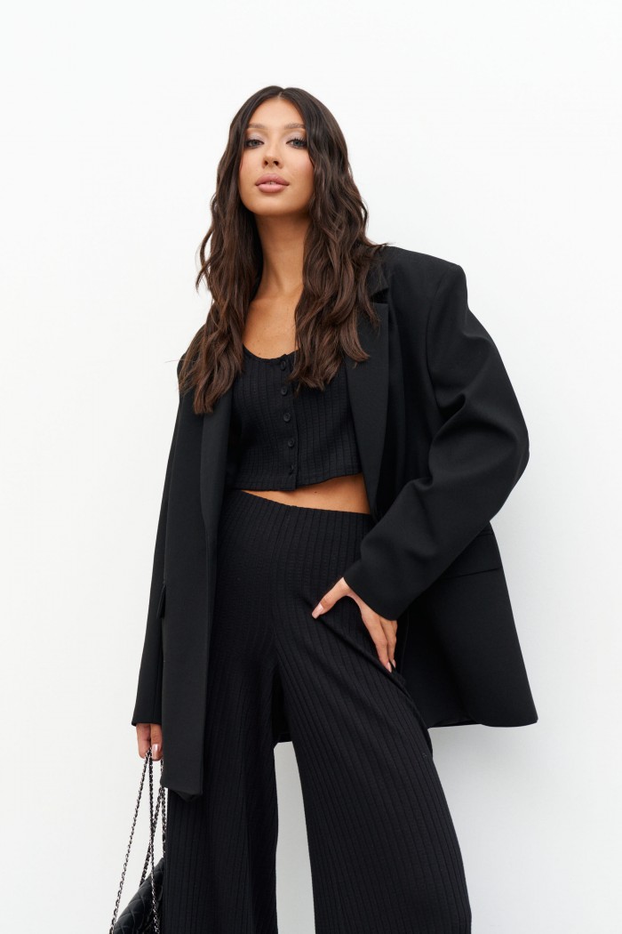 Укороченный топ выполнен из трикотажного полотна узорной вязки черного цвета. Характеристики: укороченный топ, бретели, застежка центральная на петли пуговицы. Длина 40 см. Образ дополнят брюки - артикул А1300