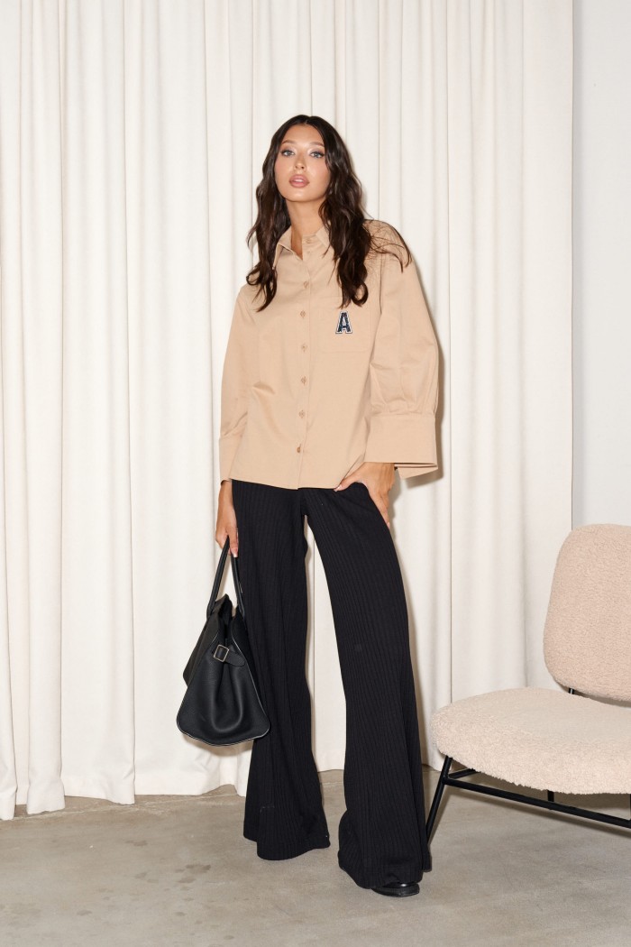 Рубашка прямого свободного кроя выполнена из полотна песочного цвета. Характеристики: прямой свободный крой, отложной воротник на стойке, застежка центральная на петли пуговицы, по переду карман с апликацией в виде буквы "А", рукав спущен, по рукаву декоративные складки, по низу рукава широкая манжета, спинка цельнокройная, по бокам изделия разрезы 10см. Длина по спинке 61 см, длина рукава от края горловины 68 см.