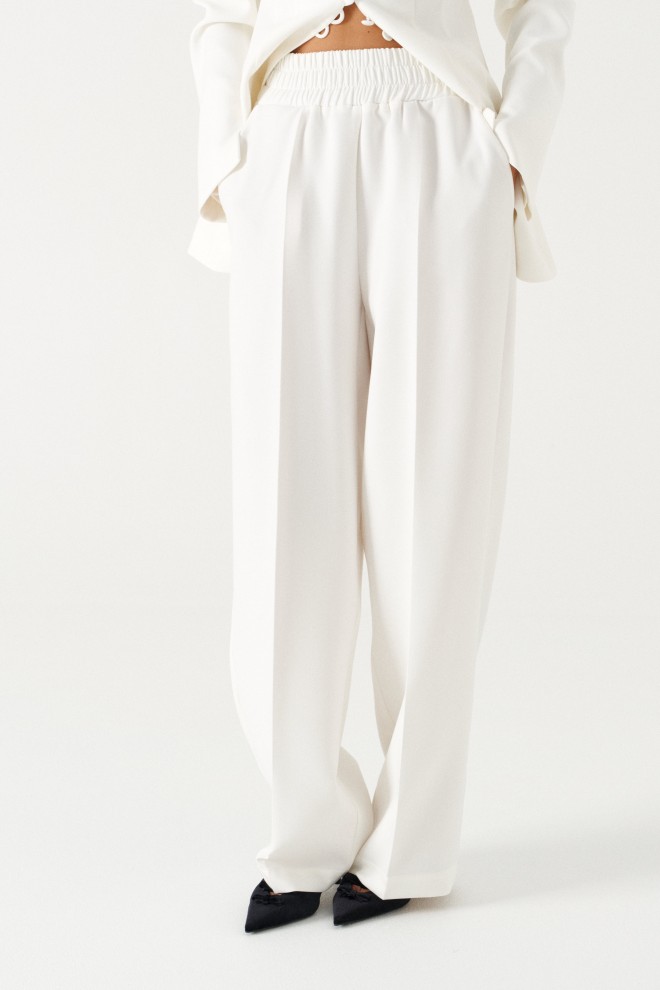 Брюки длинные, прямого силуэта, широкие. Выполнены из костюмной ткани белого цвета. Характеристика: По переду и спинке заутюжены канты. Пояс широкий притачной на резинке, с отделочными строчками. На передних частях брюк обработаны карманы с отрезным бочком. Длина брюк по боковому шву 112 см.