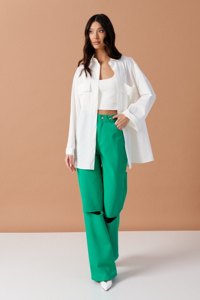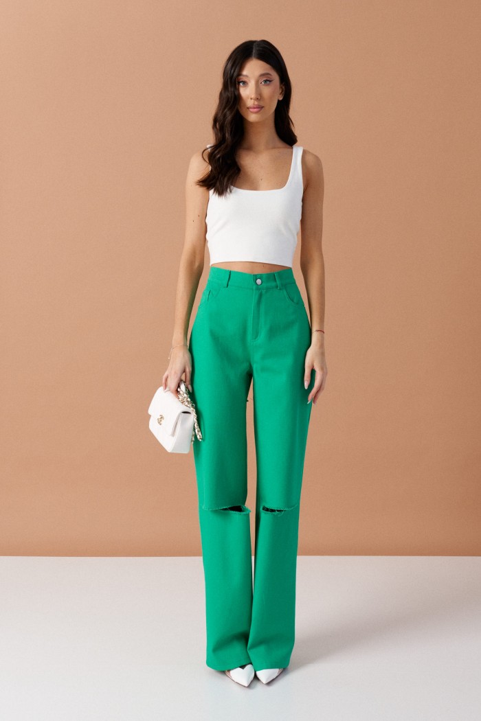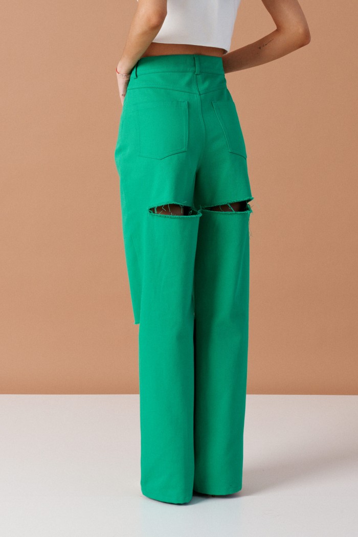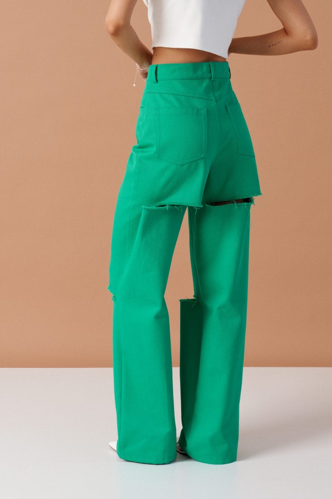 Брюки прямого кроя с декоративными разрезами выполнены из джинсового полотна зеленого цвета