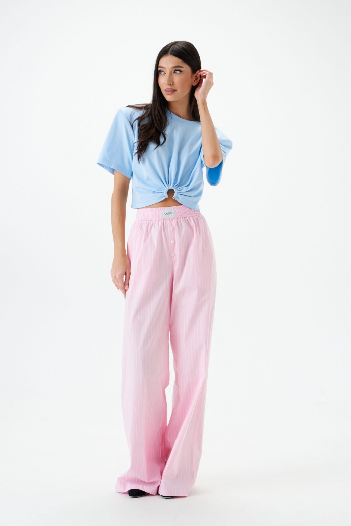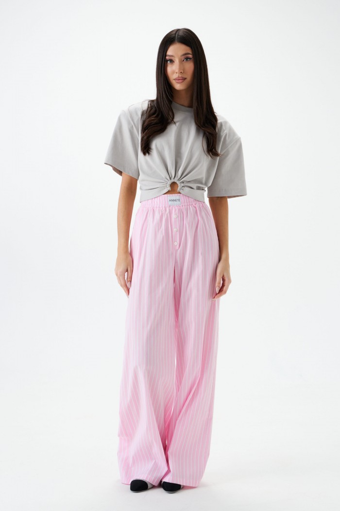 Брюки прямого кроя выполнены из розового хлопкового полотна с принтом вертикальная полоска.