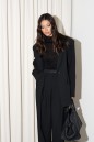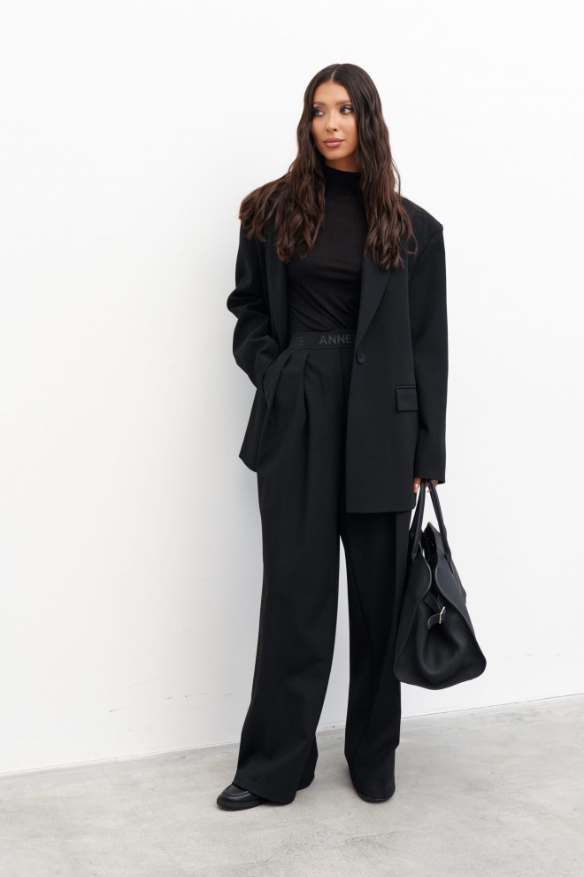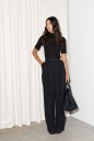 Брюки прямого кроя выполнены из ткани черного цвета. Характеристики: прямой крой, эластичная брендированная резинка, боковые карманы, на передних и задних частях брюк застрочены складки и заутюжены стрелки. Длина брюк 114 с м.