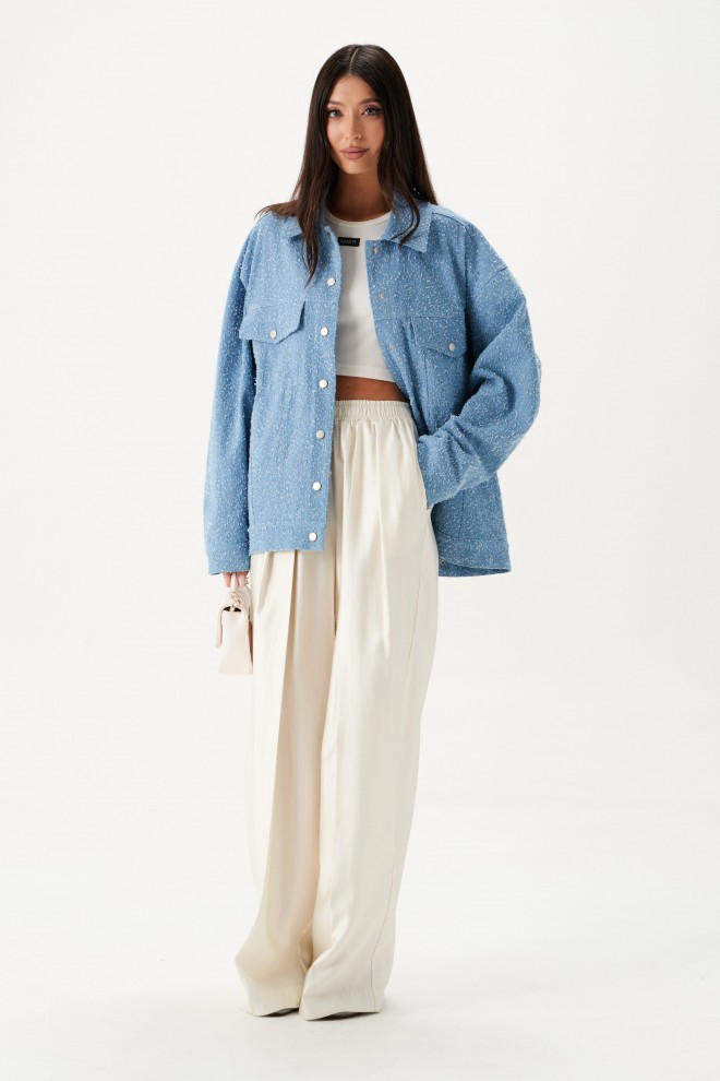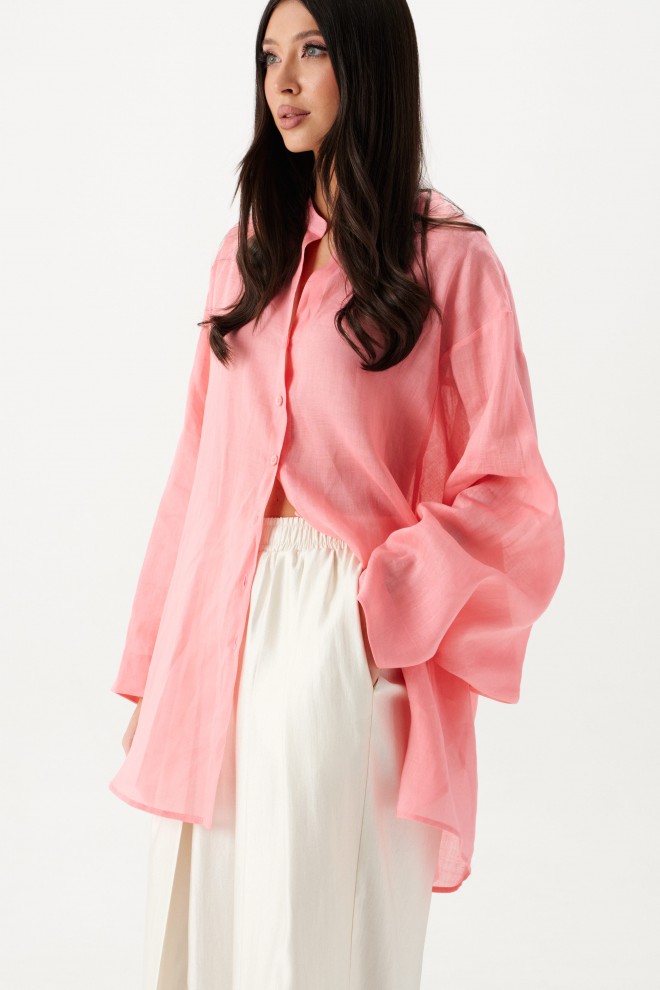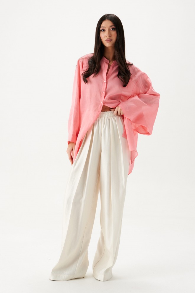 Брюки прямого свободного кроя. Выполнены из полотна молочного цвета. Пояс на резинке, заципы по переду, в боковых швах карманы, стрелки заутюжены. Длина по боковому шву 112 см.