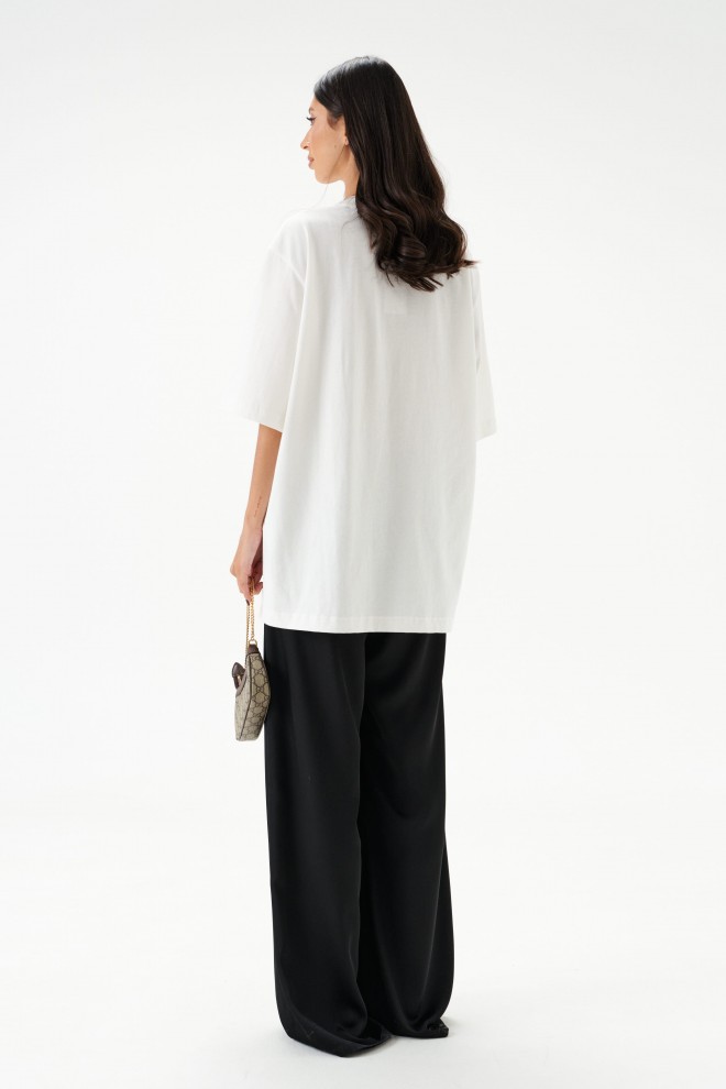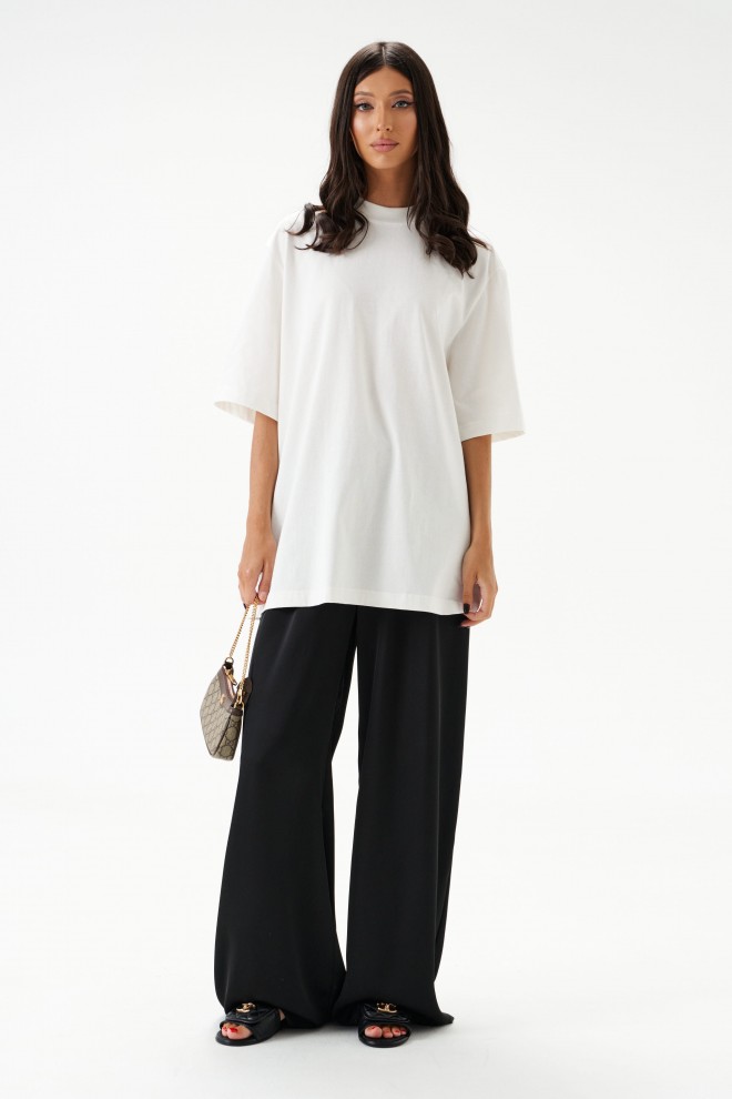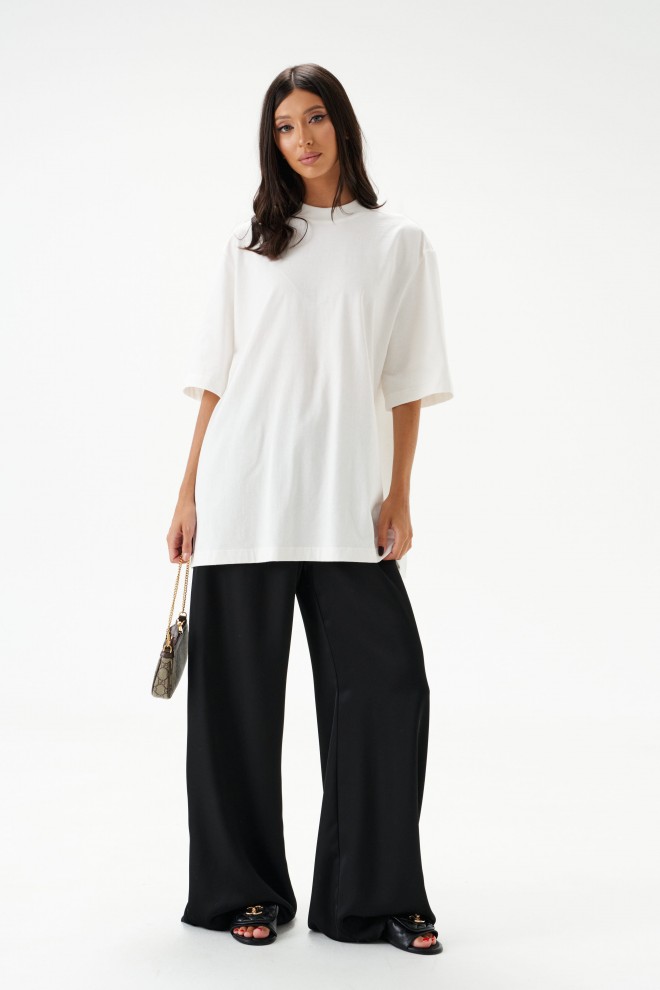 Характеристики: прямой свободный крой, пояс на кулиске, в боковых швах карманы. Длина брюк по боковому шву 111 см.