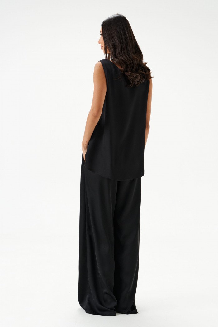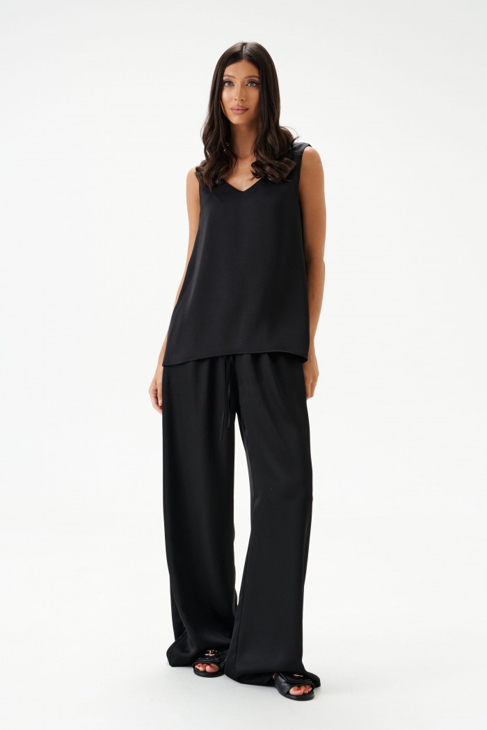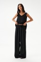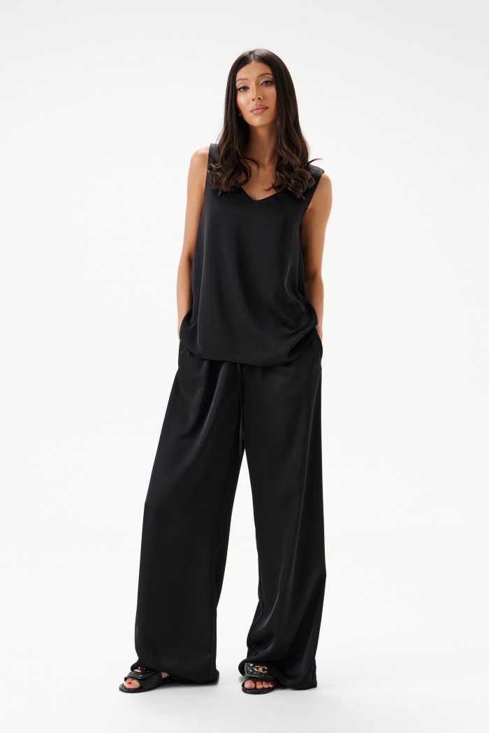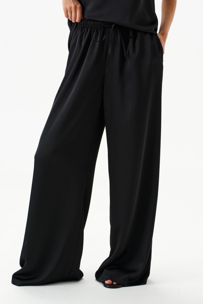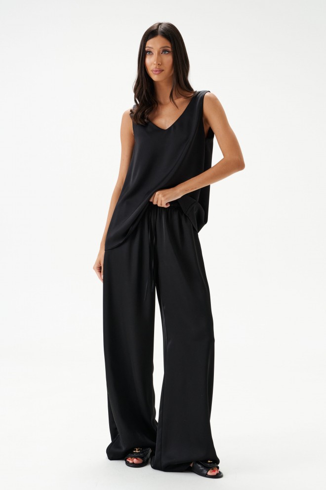 Брюки выполнены из струящейся ткани, черного цвета.