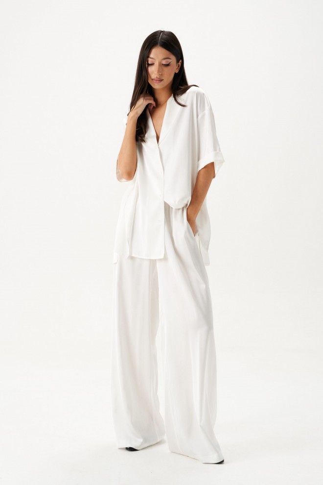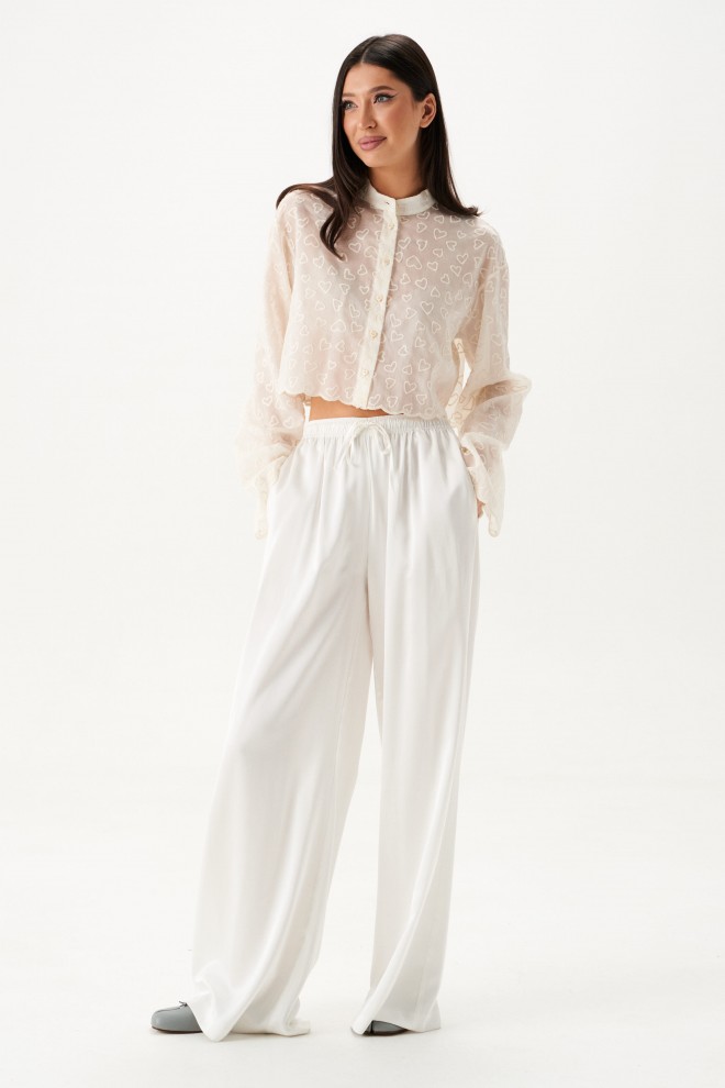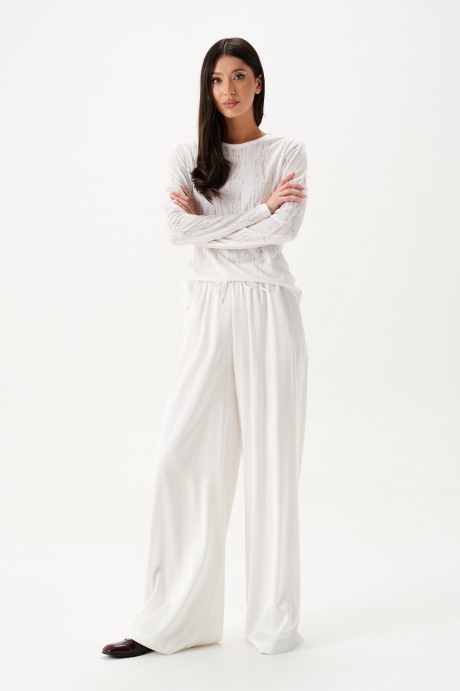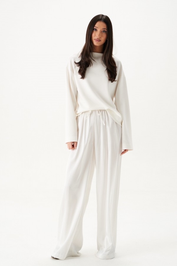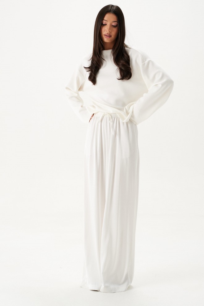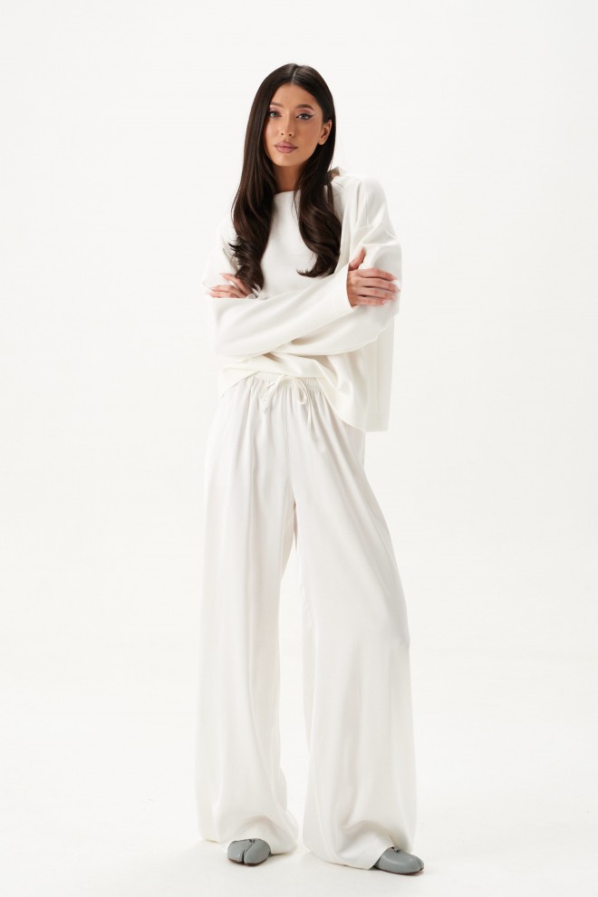 Брюки выполнены из струящейся ткани, молочного цвета.