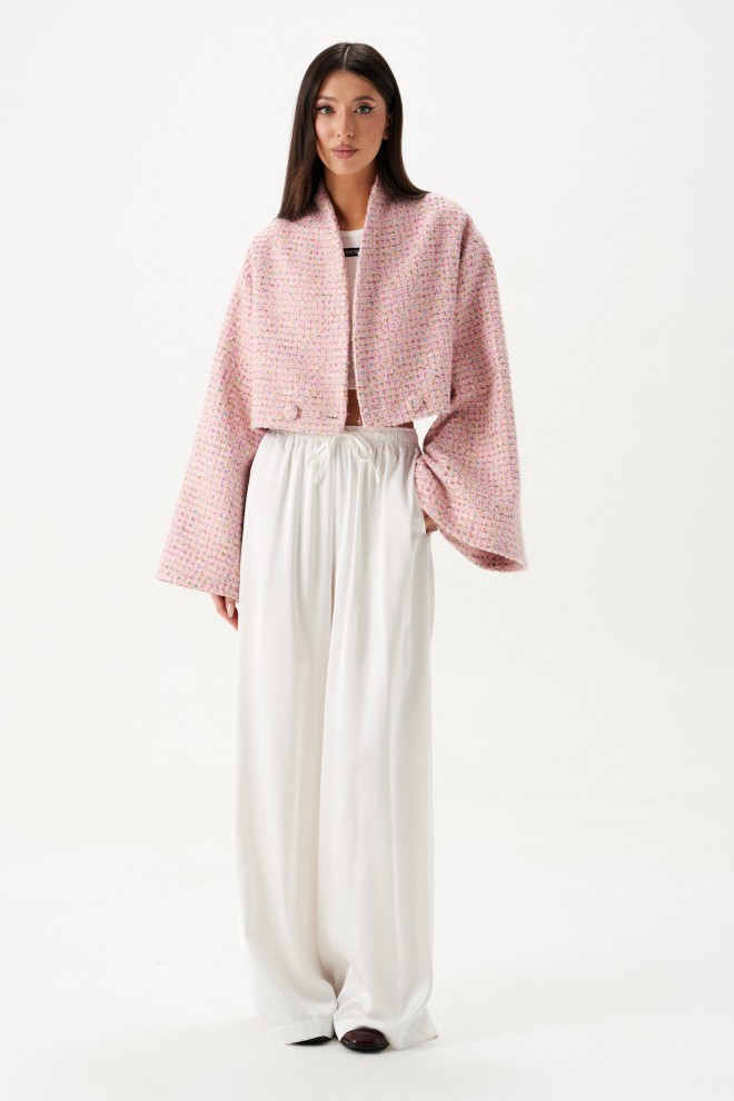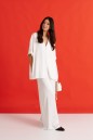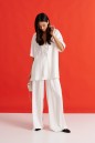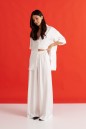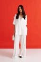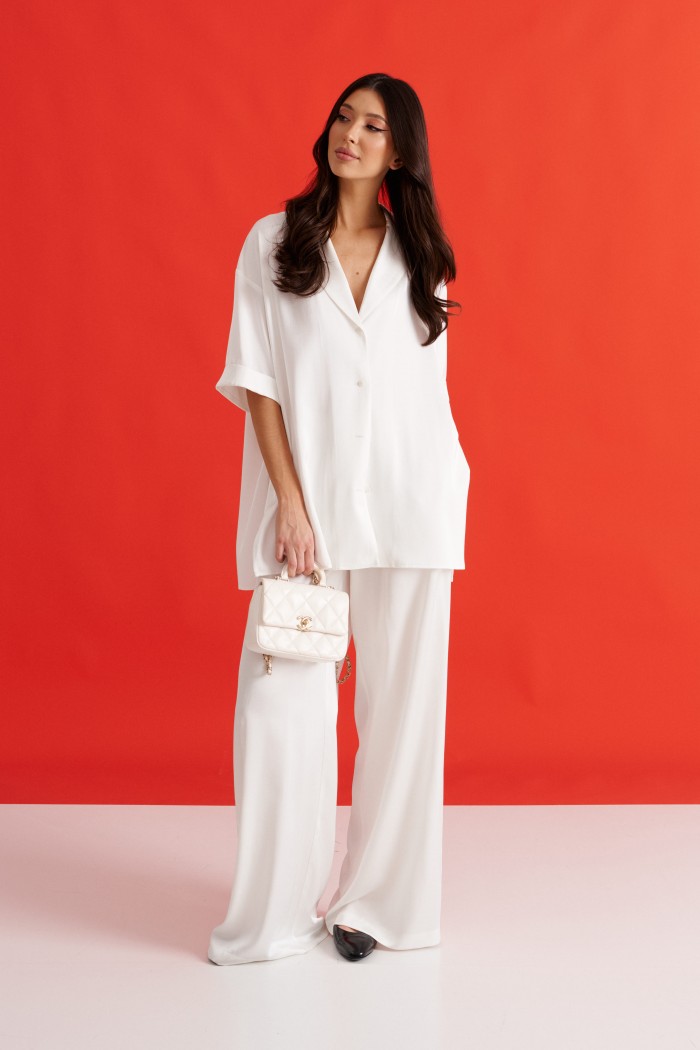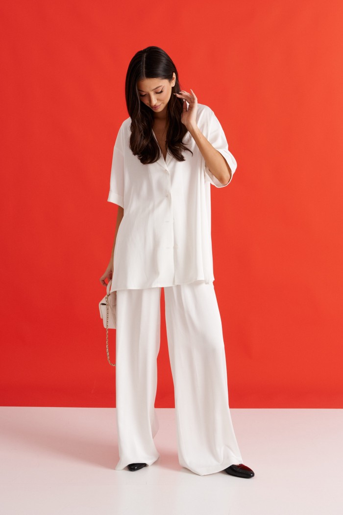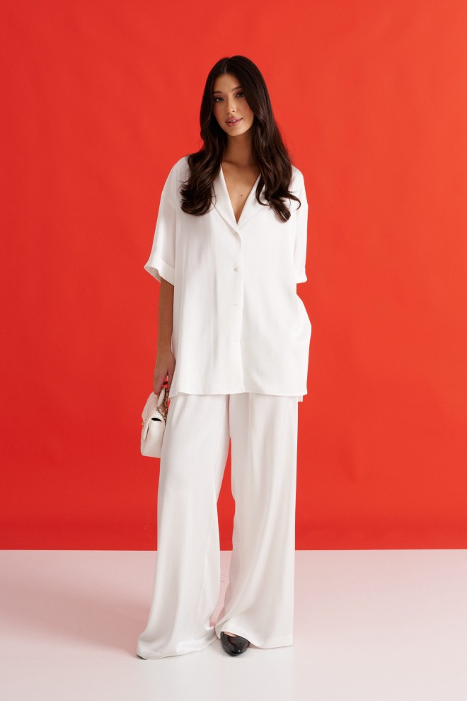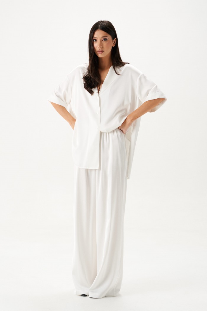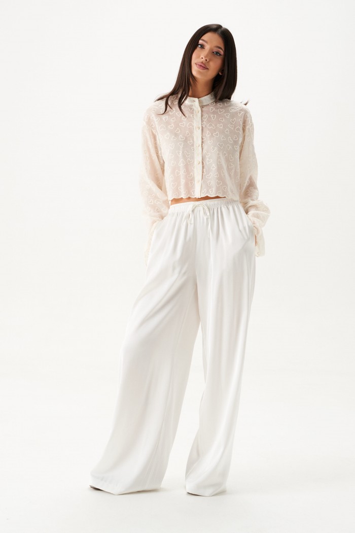 Брюки выполнены из струящейся ткани, молочного цвета.