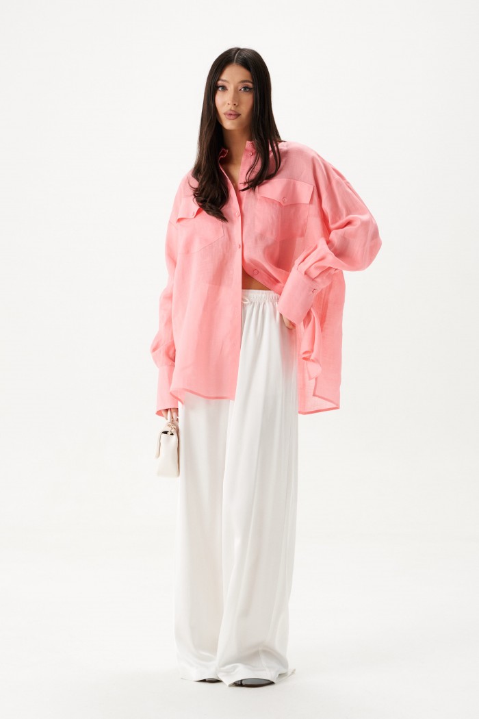 Характеристики: прямой свободный крой, пояс на кулиске, в боковых швах карманы. Длина брюк по боковому шву 111 см.