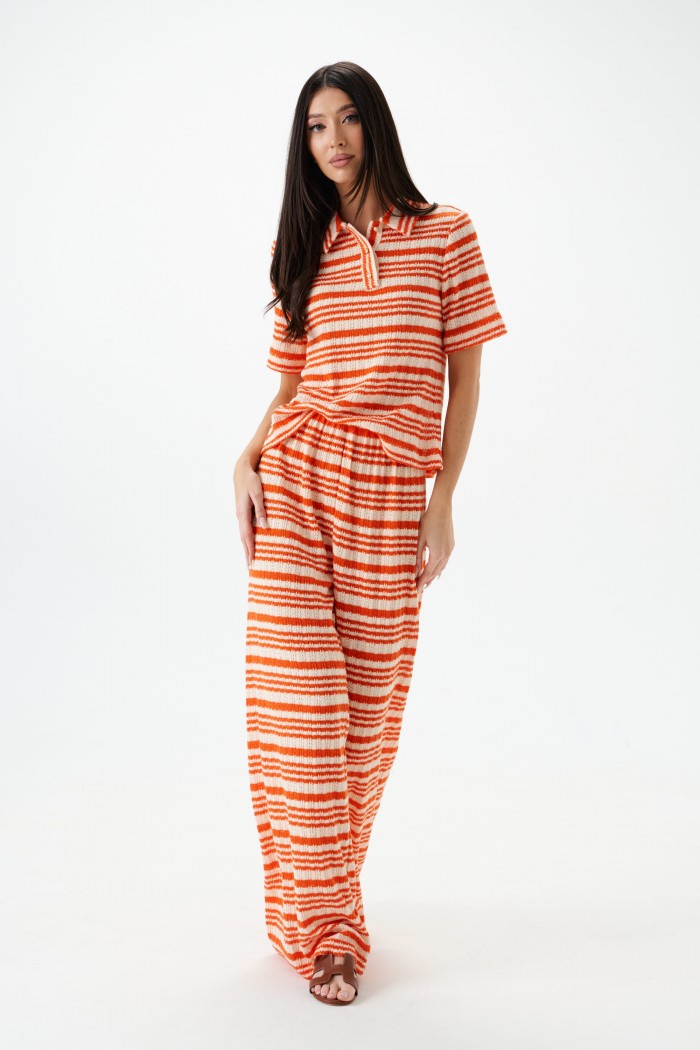 Брюки прямого свободного кроя. Выполнены из вязаного трикотажа. Характеристики: прямой крой, пояс на резинке. Длина по боковому шву 108 см
