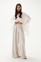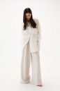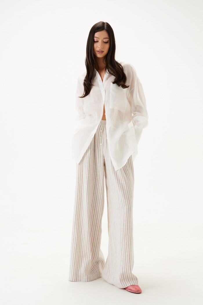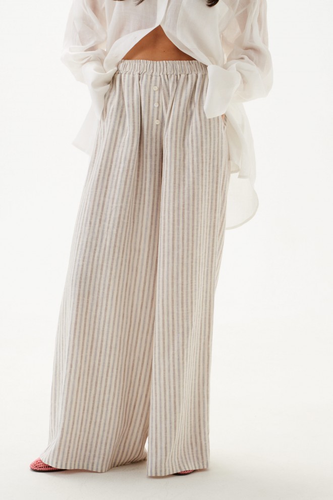 Брюки свободного кроя. Выполнены из льняного (смесового) полотна. Пояс на резинке. По переду имитация застёжки с пуговичками. Наклонные карманы. Длина 110 см