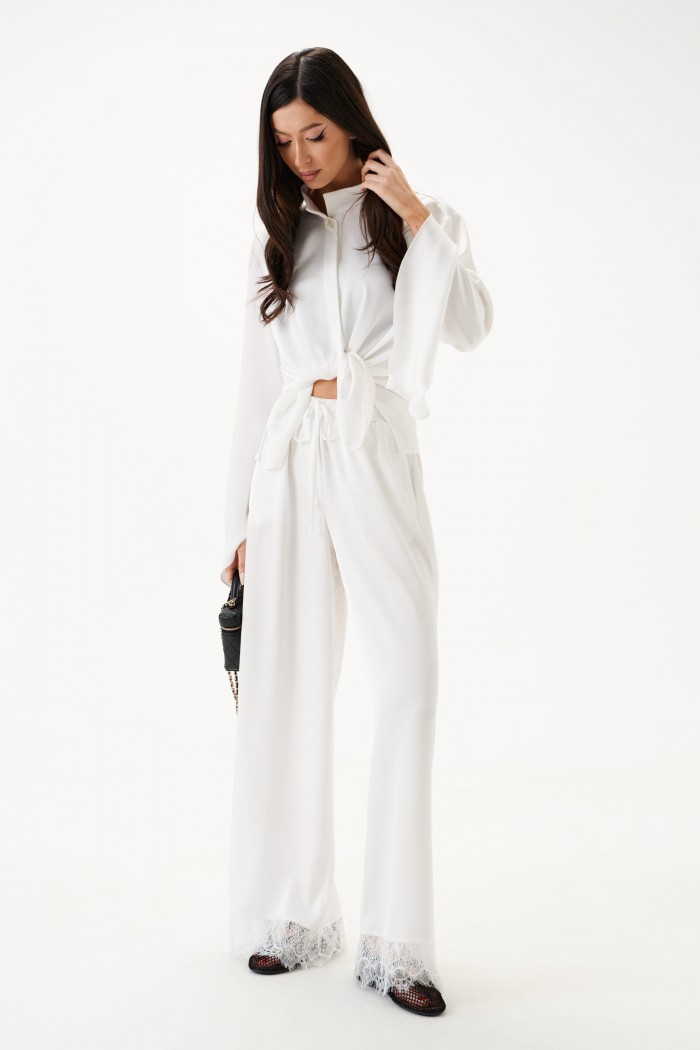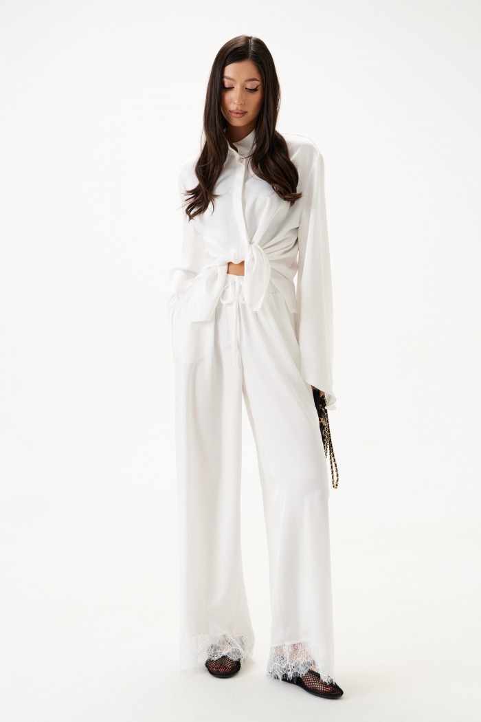 Брюки свободного кроя. Выполнены из мягкой струящейся ткани. Пояс на резинке. По низу кружево. Длина с учётом кружева 108 см