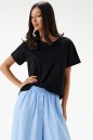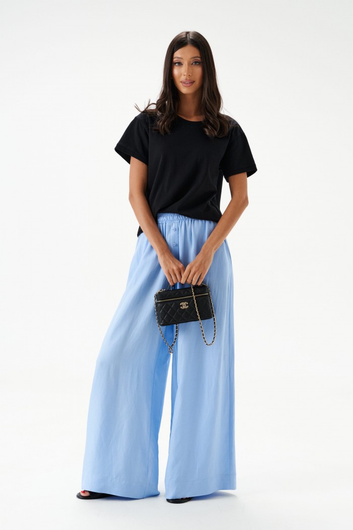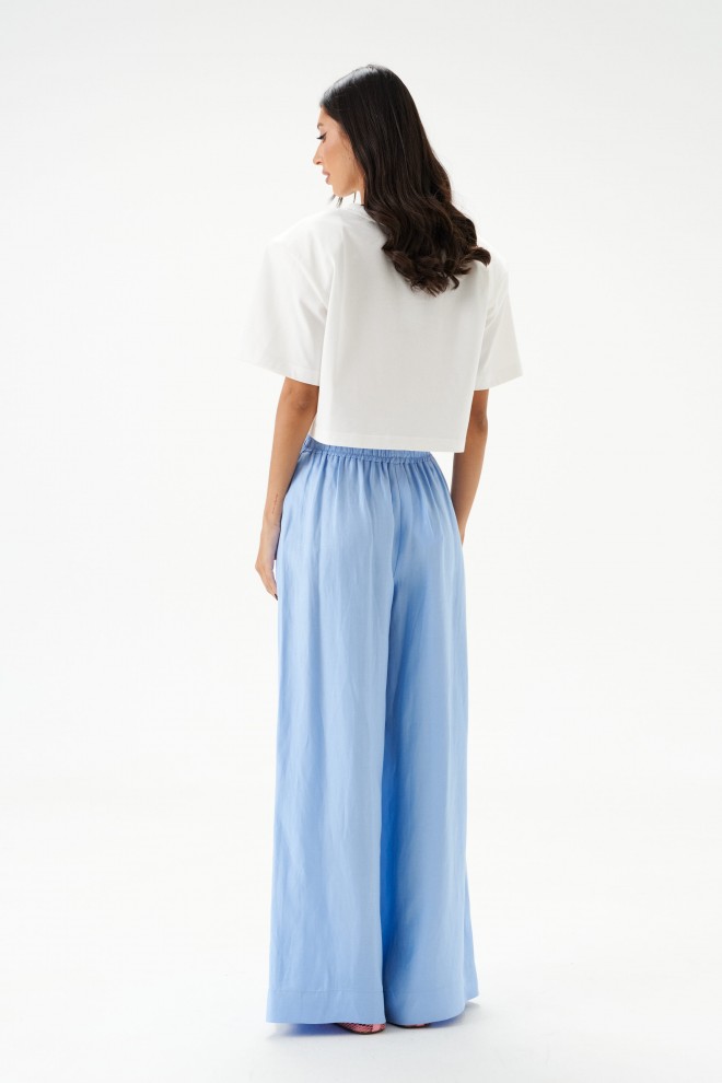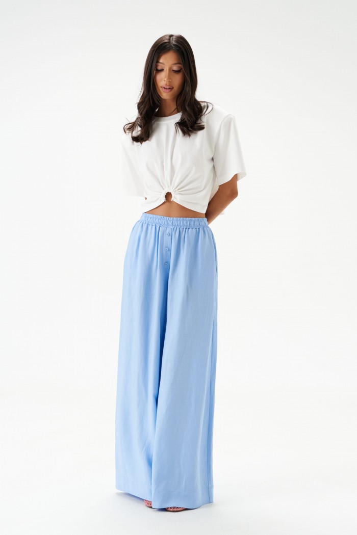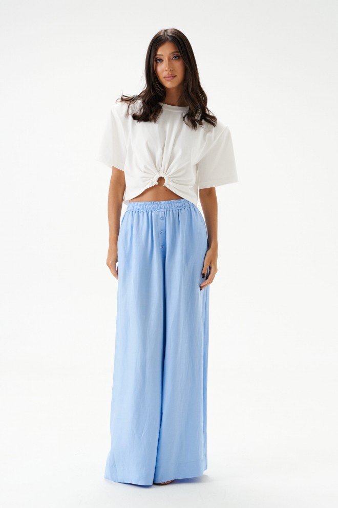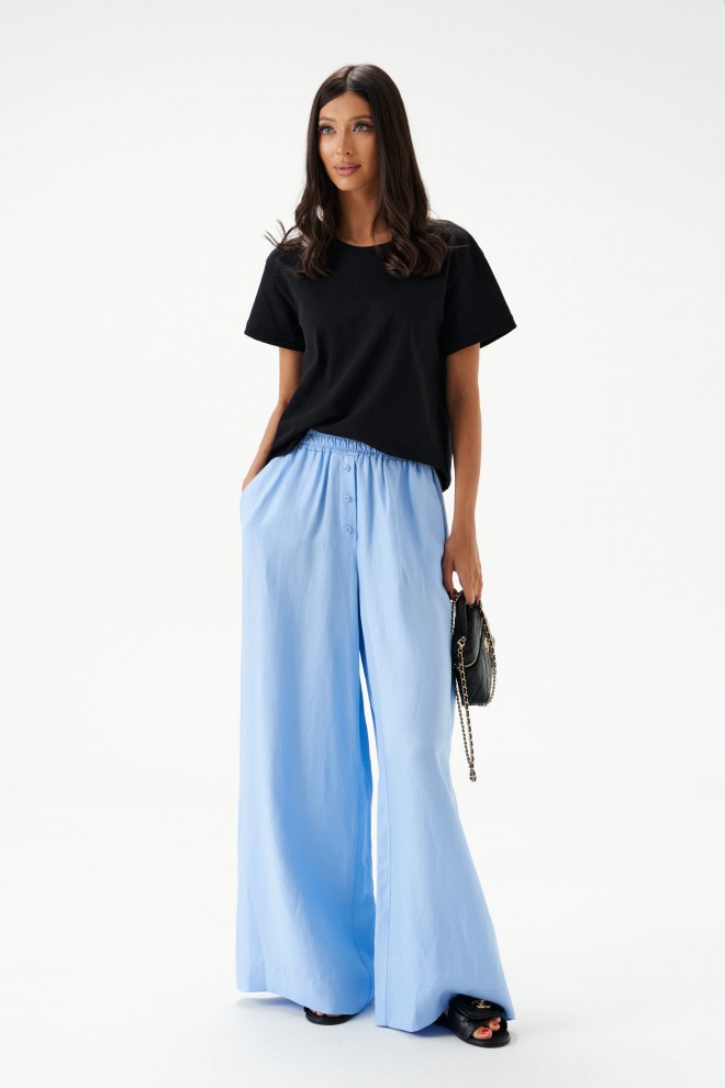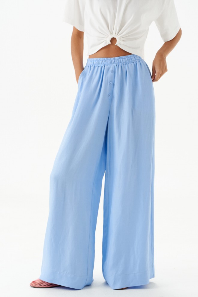 Брюки свободного кроя. Выполнены из вискозно-льняной ткани голубого цвета. Пояс на резинке. В боковых швах карманы с отрезным бочком. По переду имитация застёжки. Длина по боковому шву 106 см. Брюки дополнит рубашка А2184