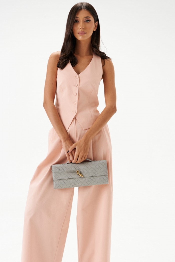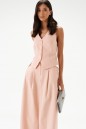 Брюки свободного кроя. Выполнены из хлопкового полотна нежно-розового цвета. Пояс по переду стабильный, пояс по спинке на резинке. По переду от пояса складки. В боковых швах карманы с отрезным бочком. По заднему полотну накладные клапаны (имитация карманов). Застёжка центральная – молния, пуговица. Длина по боковому шву 102 см. Брюки дополнит жилет А5483/1