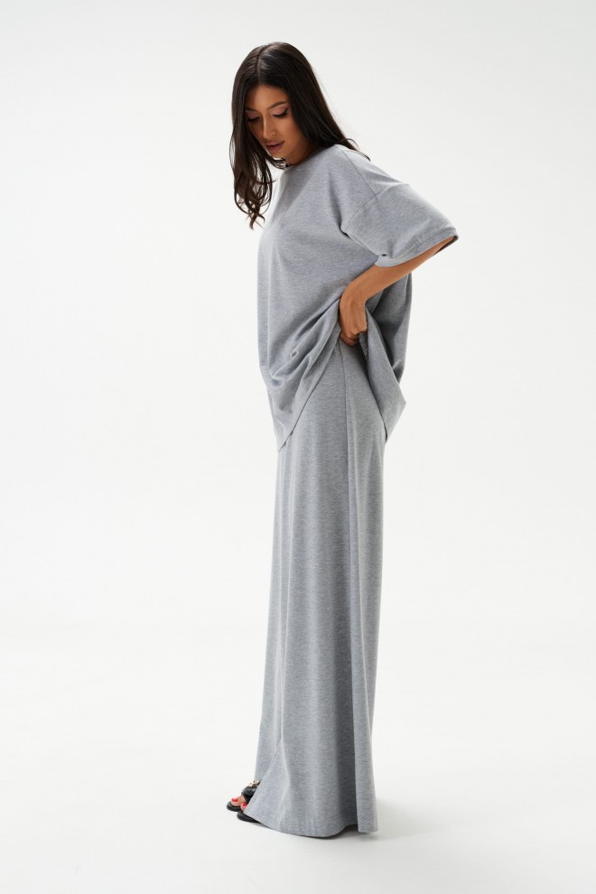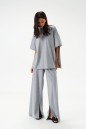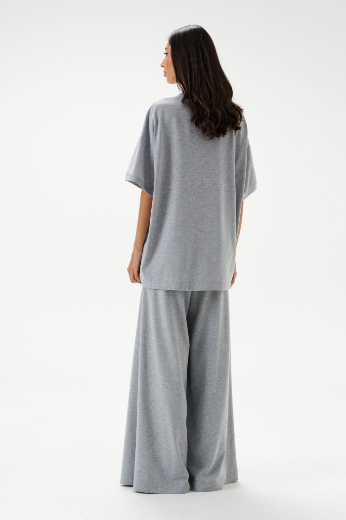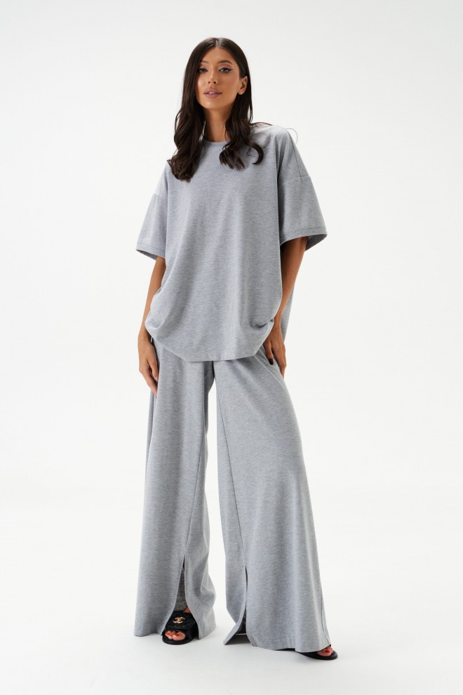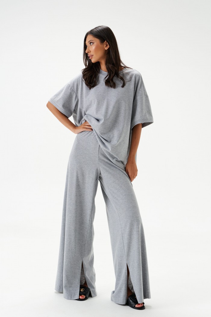 Брюки прямого кроя выполнены из трикотажного полотна серого цвета.