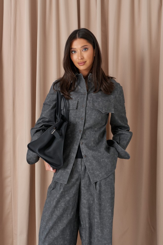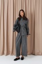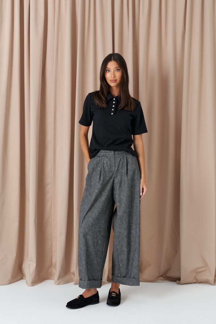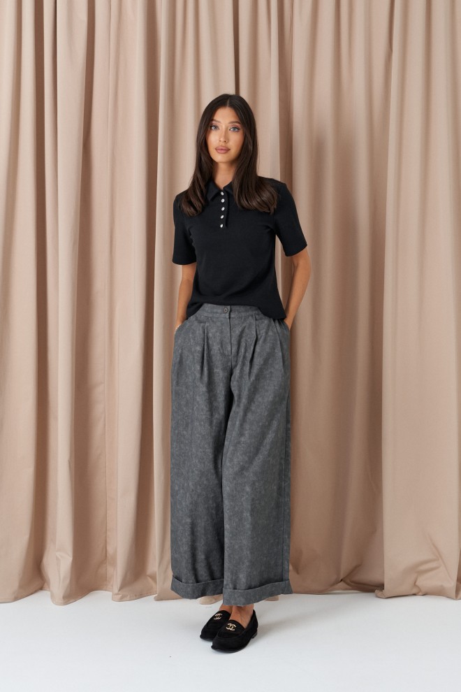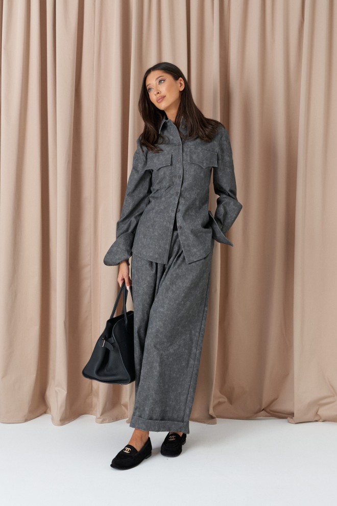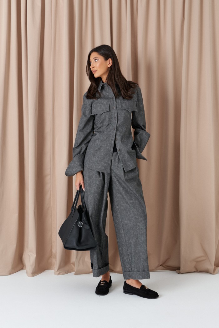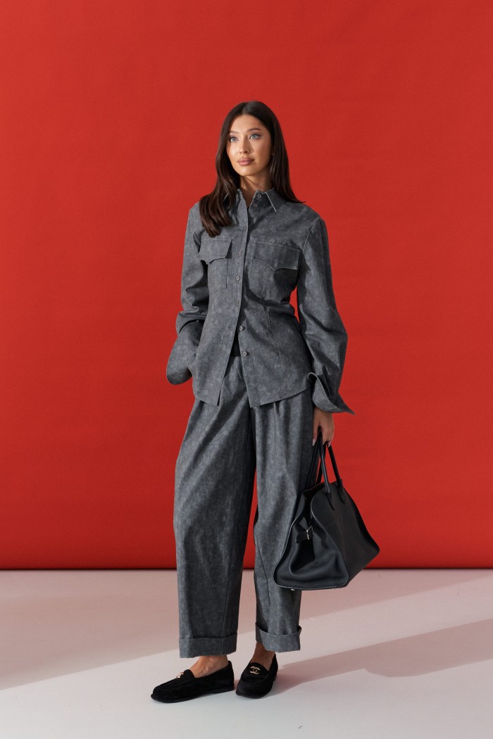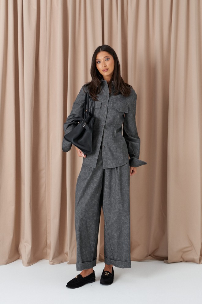 Брюки свободного кроя. Выполнены из денима серого цвета с имитацией потёртости. Пояс стабильный по переду, на резинке по спинке. Застёжка центральная пуговица, молния. От пояса складки. Из боковых швов карманы. По заднему полотну имитация карманов с клапанами. Длина 103 см