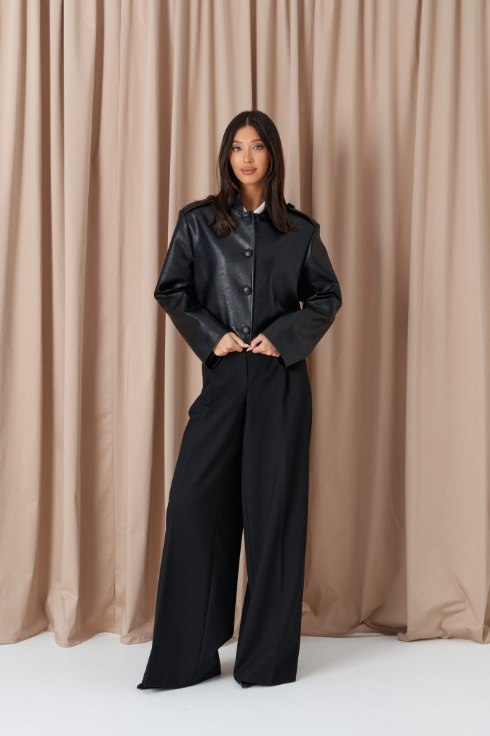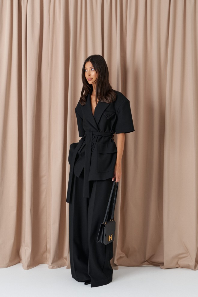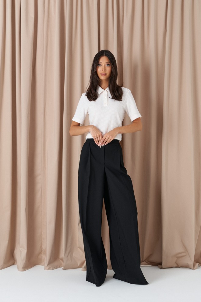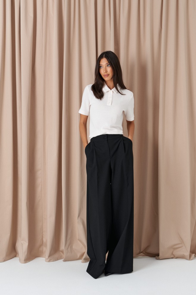 Брюки-палаццо свободного кроя. Выполнены из текстильного полотна черного цвета. В боковых швах карманы с отрезным бочком. Стабильный пояс без шлевок. По передузастежка молния и пуговица. Длина 113 см