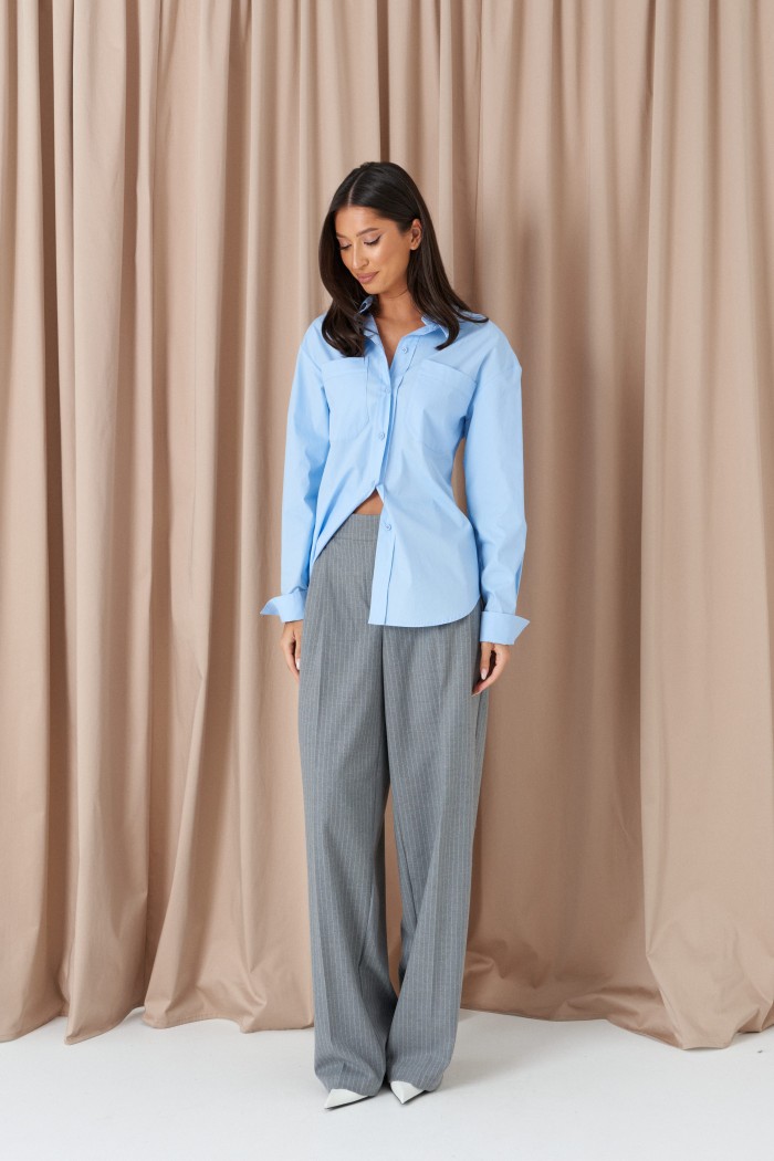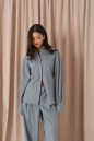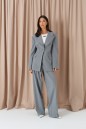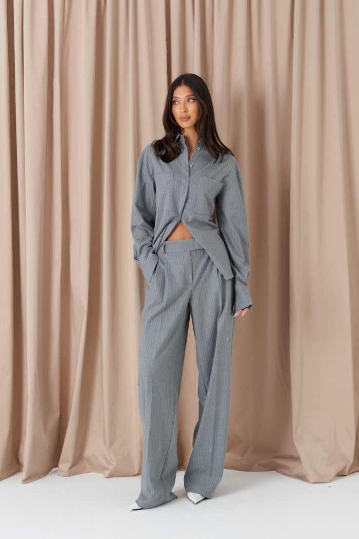 Брюки прямого кроя выполнены из текстильного полотна серого цвета в мелкую полоску. Характеристики: прямой крой, пояс стабильный, по поясу нашиты шлевки, декоративная сборка по передней части, заутюженные стрелки по переднему и заднему полотну брюк, в боковых швах карманы, застежка на молнию и 2 крючка. Длина изделия 111 см.