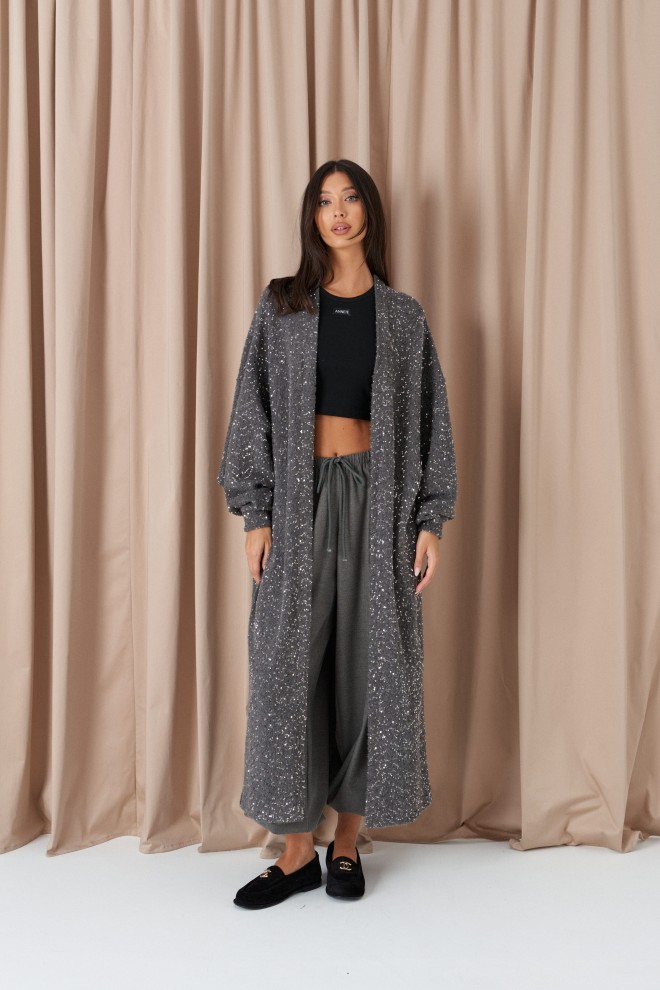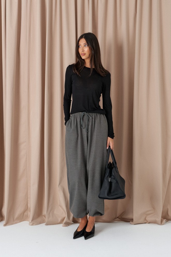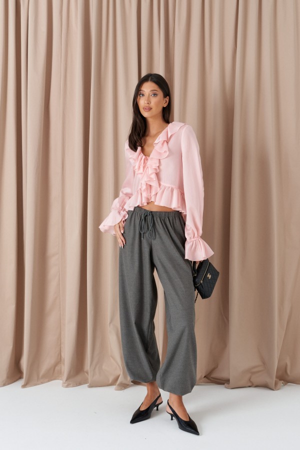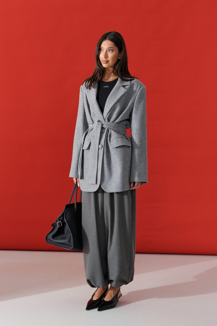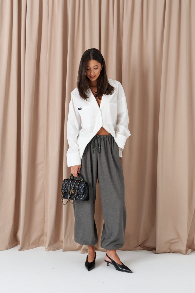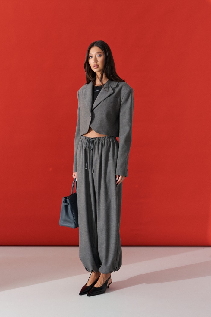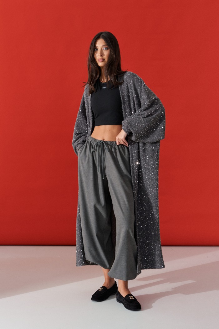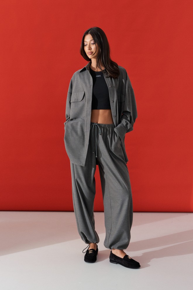 Брюки-джоггеры. Выполнены из мягкого текстильного полотна цвета серый меланж. Характеристики: прямой крой, пояс на резинке, в боковых швах карманы, штанина внизу на резинке с фиксатором. Длина 107 см.