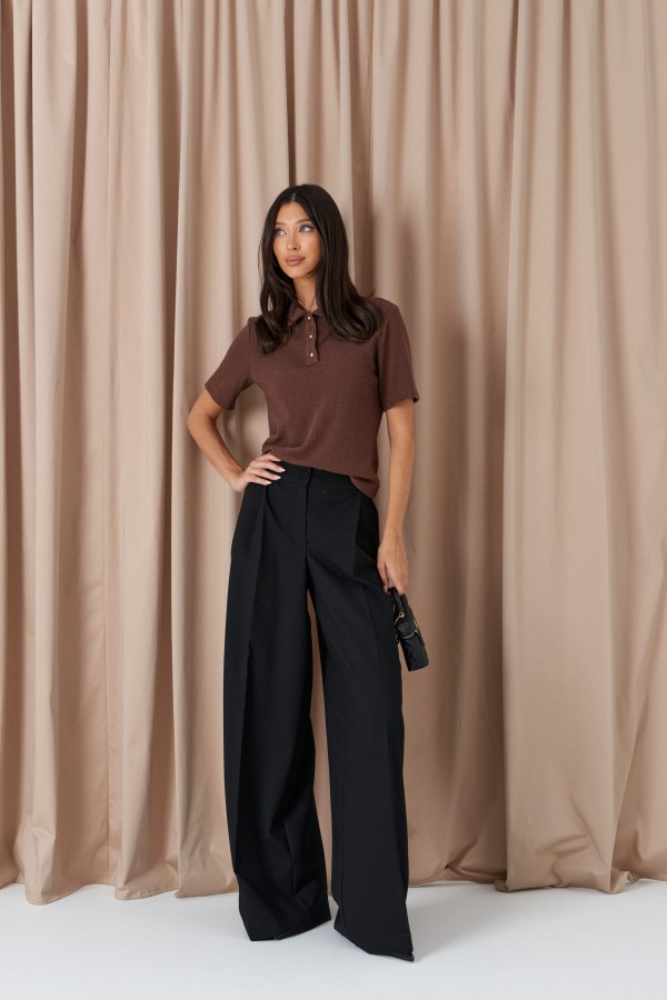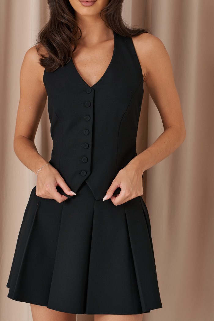 Юбка трапеция выполнена из текстильного полотна черного цвета. Харектеристики: силуэт трапеция, сзади застежка- потайная молния, складки, в боковых швах карманы. Длина 38 см.